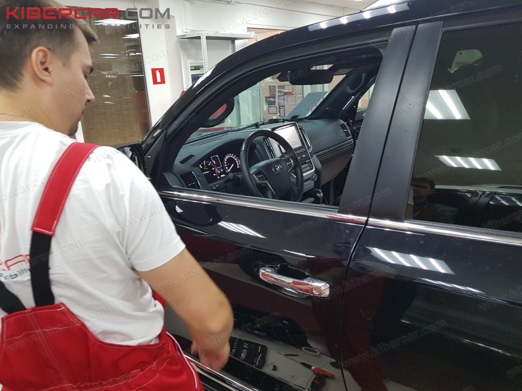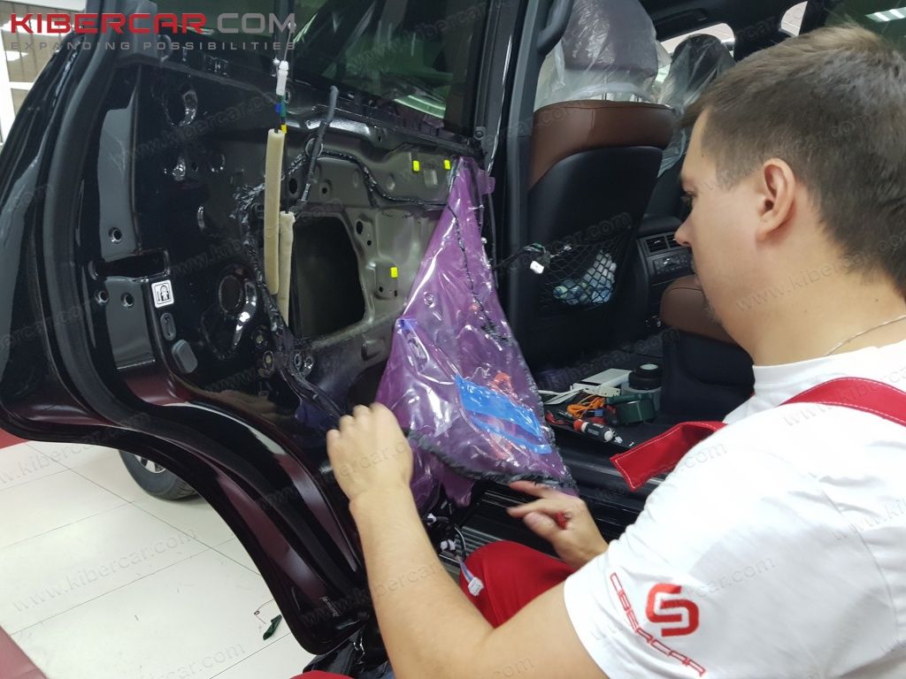 Для начала работы мы подготавливаем автомобиль. Защитной пленкой упаковываем салон и места, наиболее подверженные повреждениям. Далее снимаем обшивку дверей, чтобы появился доступ к основным замкам.