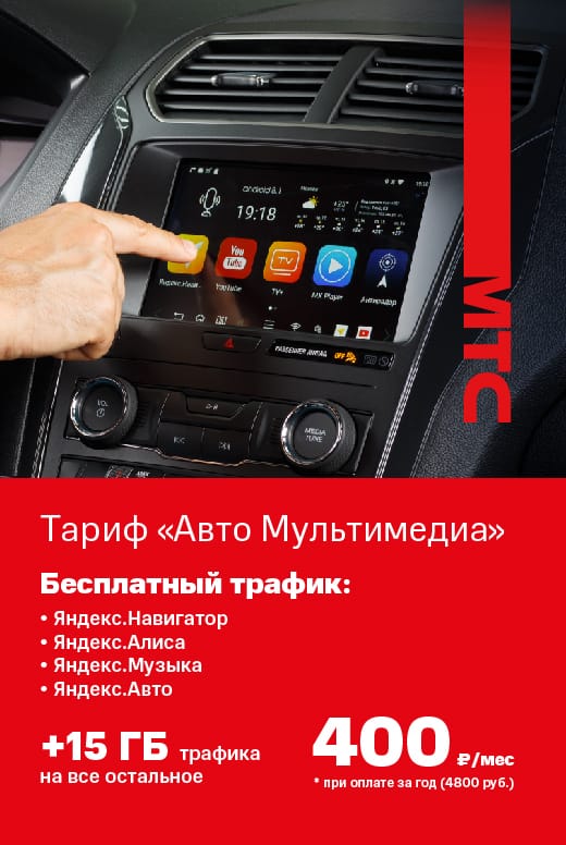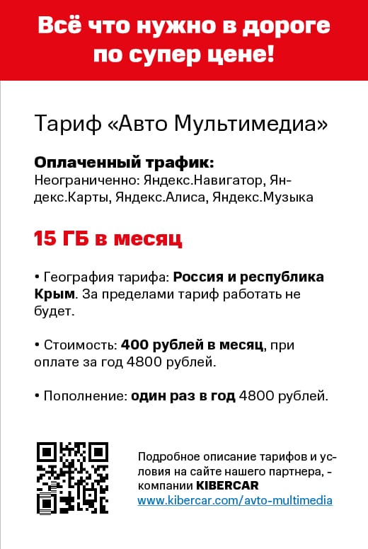 Условия тарифа “Автомультимедиа” разработаны с учетом особенностей транспорта со встроенной мультимедийной системой (AirTouch Performance или Q-Link) и активным использованием сервисов Яндекс.