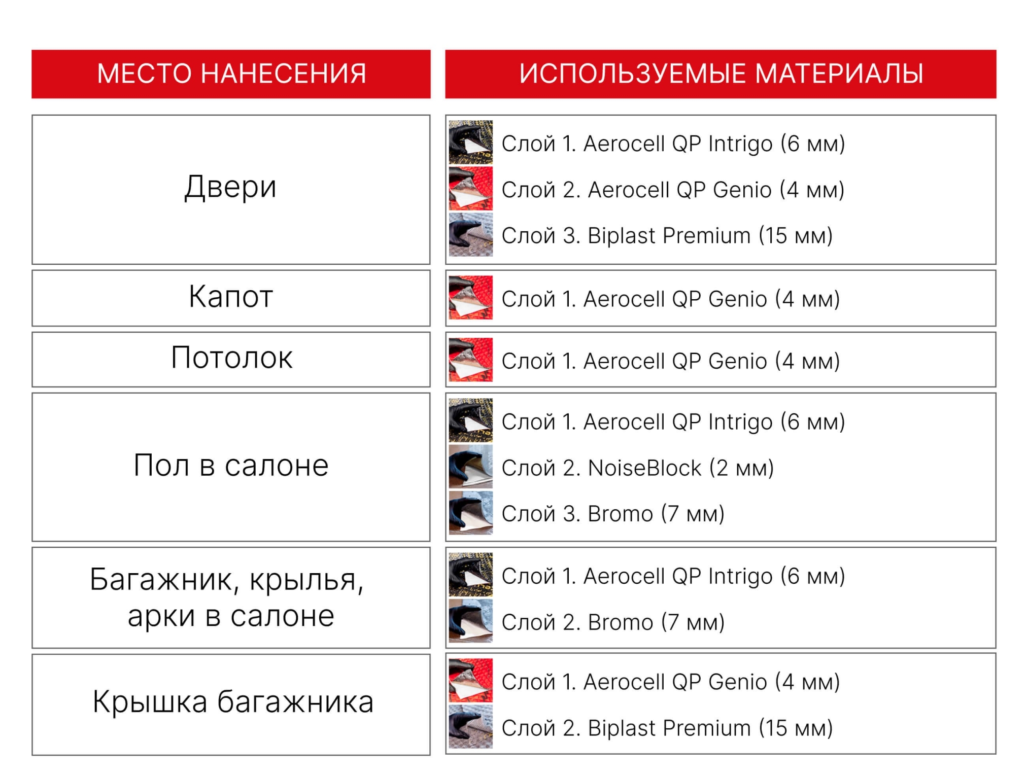 Обработке подлежат те же зоны, что и в пакетах Базовый и Максимальный, а дополнительно – торпедо и моторный щит. В капсульном пакете используются премиальные материалы STP – Aerocell Genio и Aerocell Intrigo, BiPlast Premium 15.