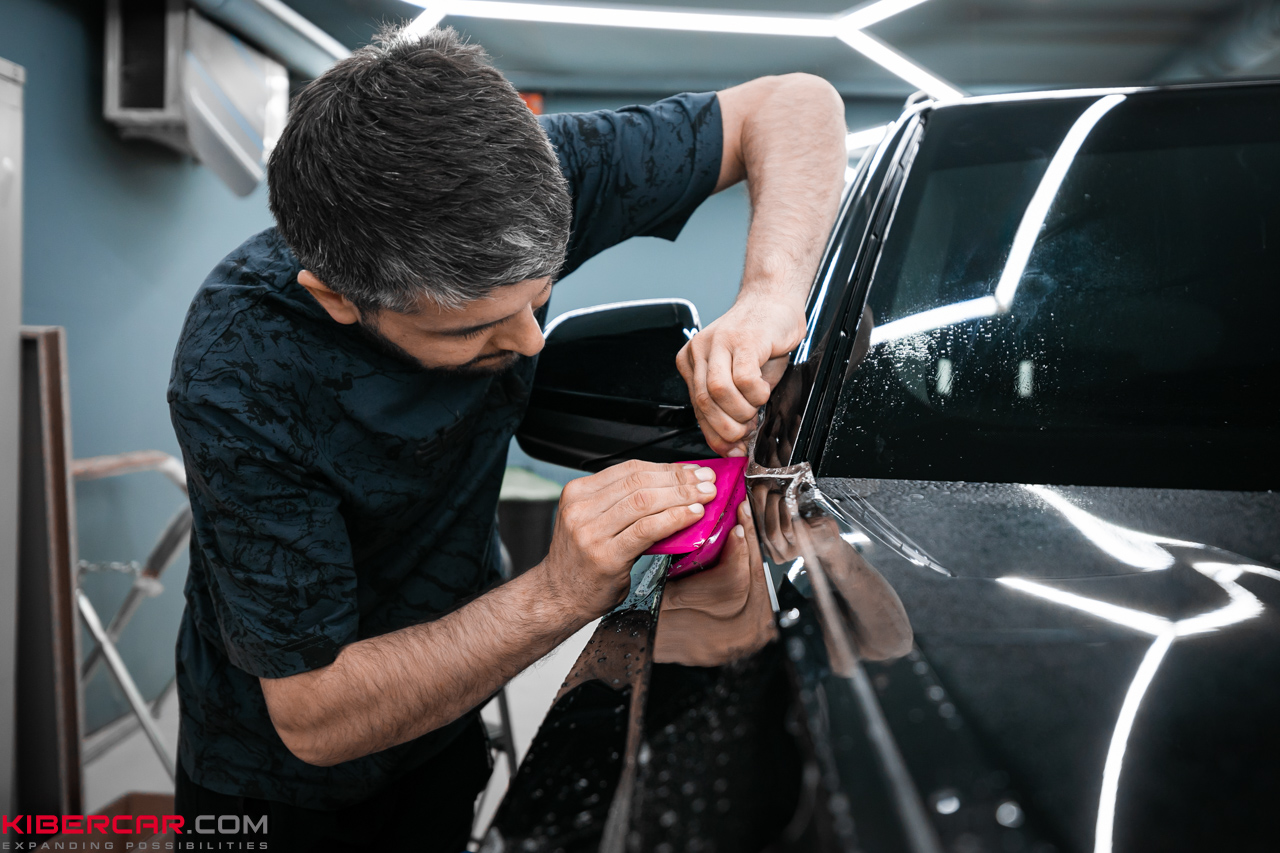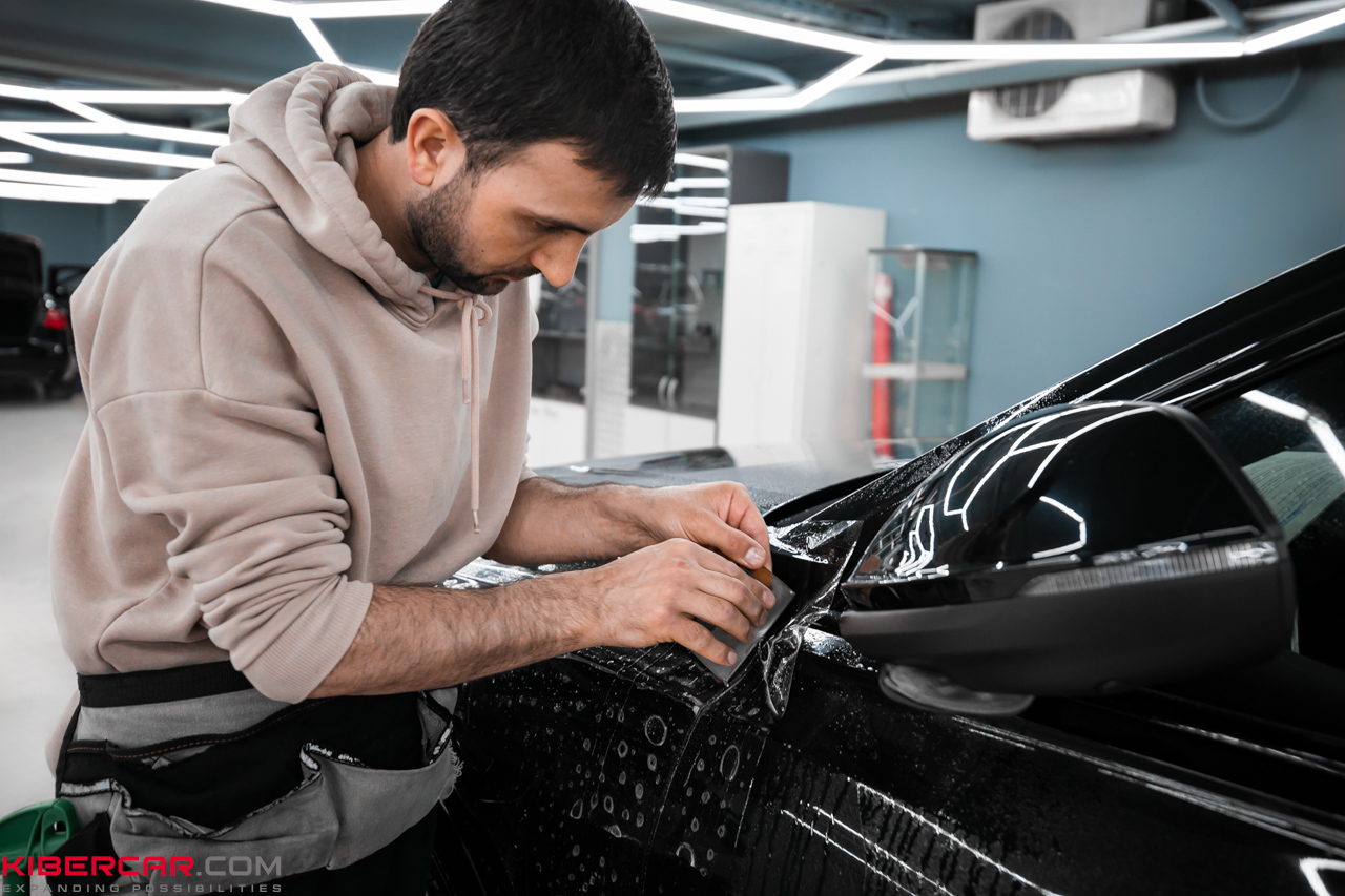 Нанесение пленки. Мастера нарезают пленку по элементам автомобиля, смачивают деталь раствором на основе воды и мыла, и затем наносят мокрую пленку на поверхность. Пленка должна быть немного больше детали, чтобы её можно было натянуть, аккуратно подрезать и загнуть по краям. Это обязательное условие, чтобы обеспечить надежную фиксацию пленки на долгие годы.