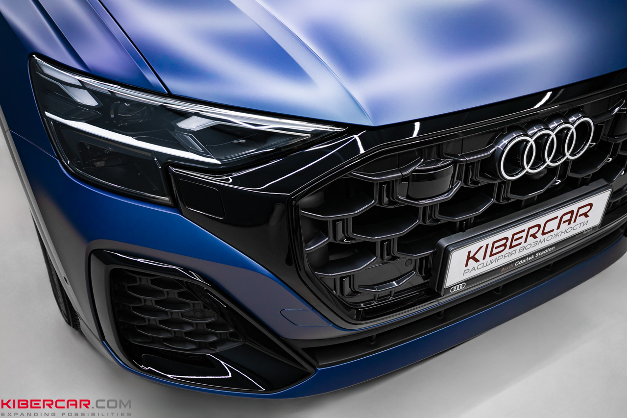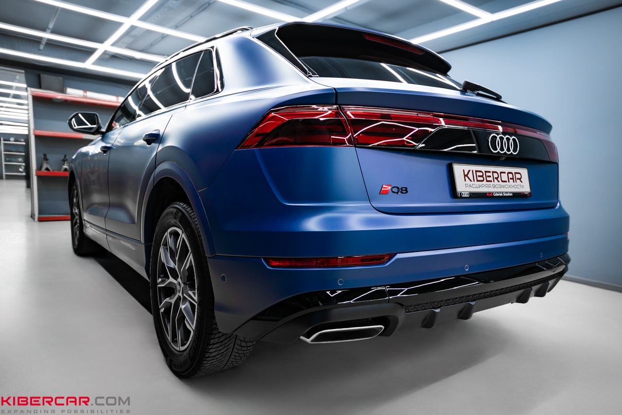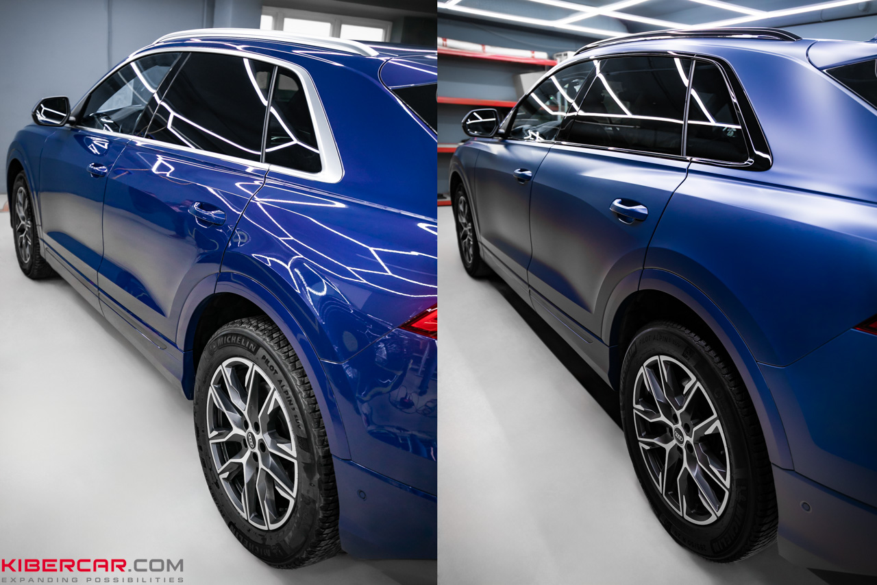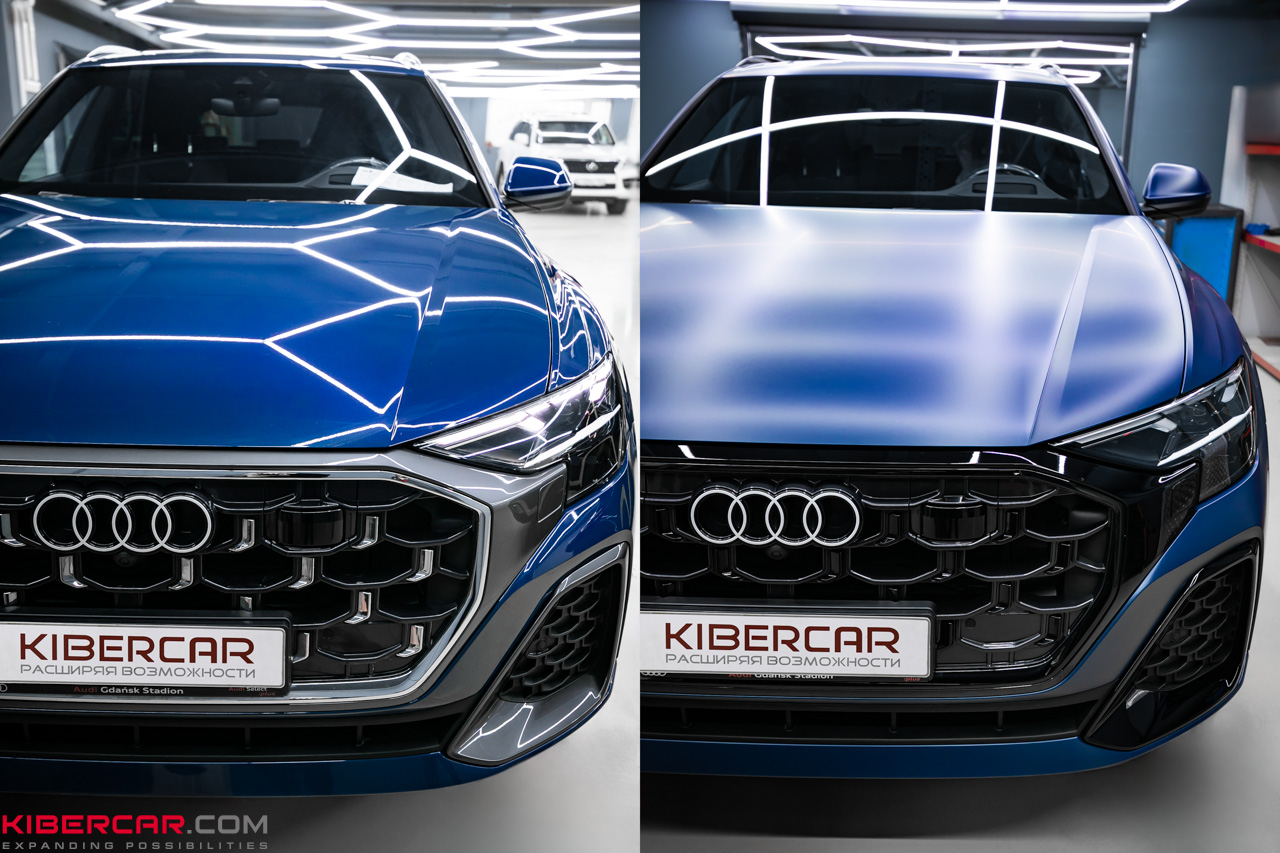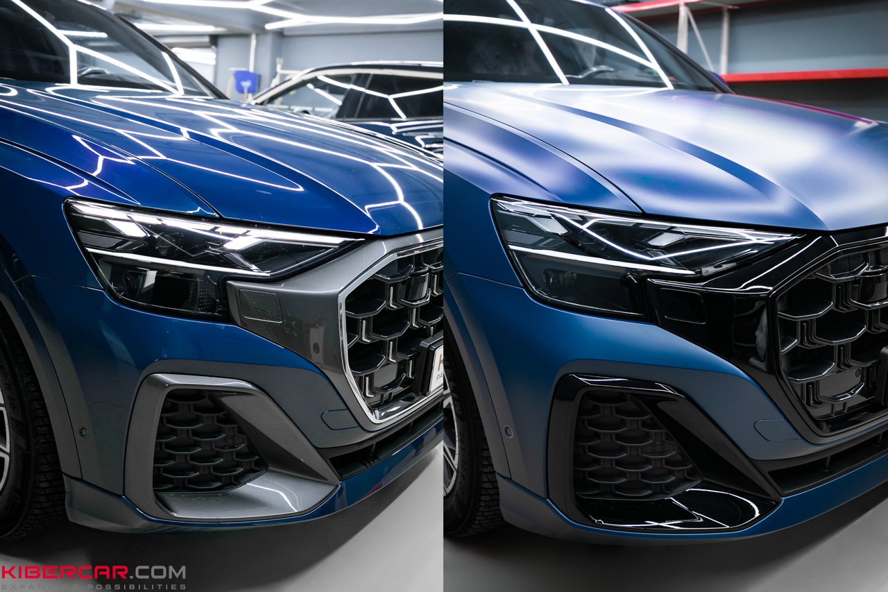 Недавно в наш центр приехал Audi Q8 с глянцевым кузовом синего цвета. Владелец захотел сделать кузов матовым, а также выполнить «антихром», то есть убрать хромированное покрытие отдельных элементов и заменить его на цветное.