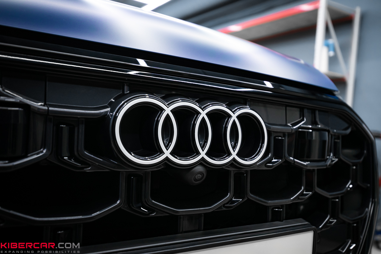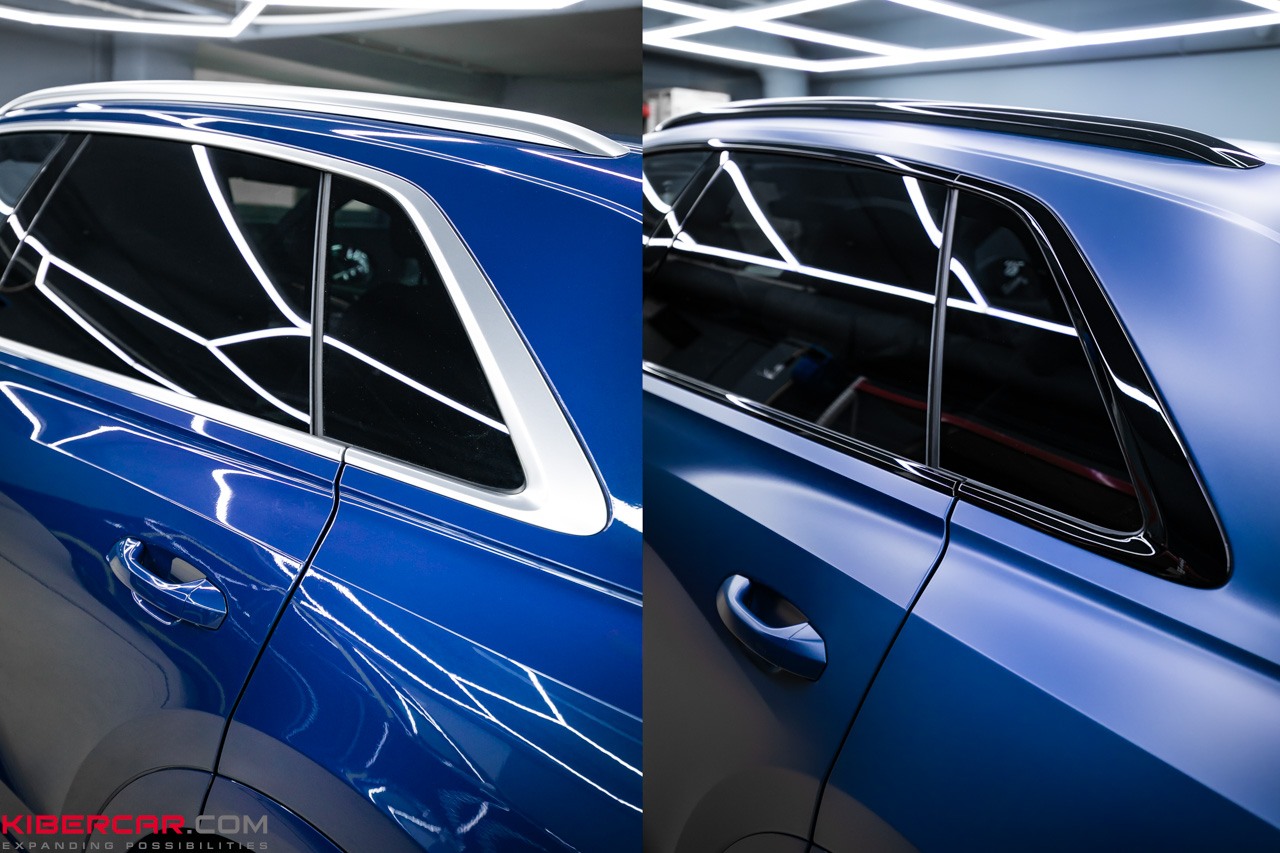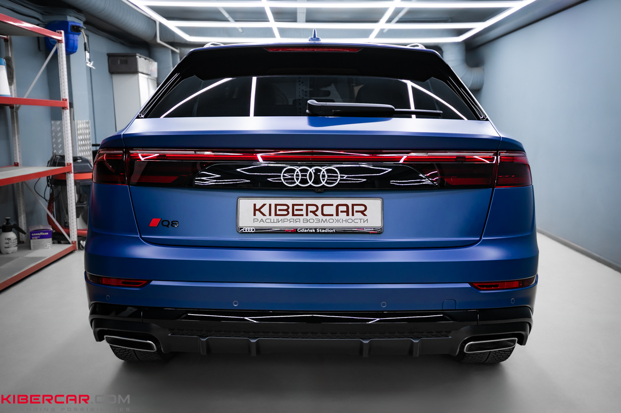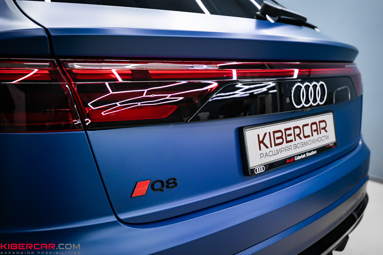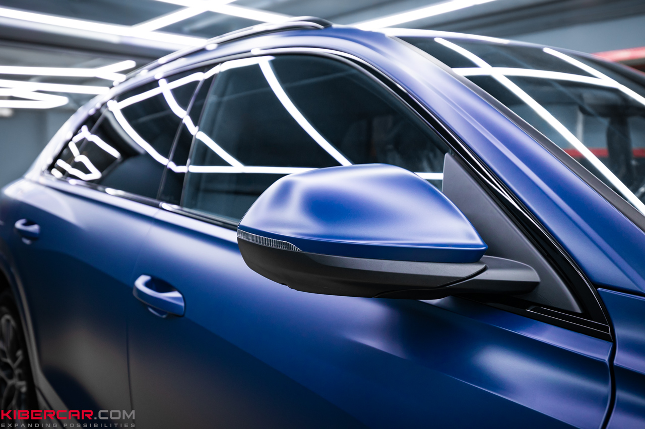 Недавно в наш центр приехал Audi Q8 с глянцевым кузовом синего цвета. Владелец захотел сделать кузов матовым, а также выполнить «антихром», то есть убрать хромированное покрытие отдельных элементов и заменить его на цветное.