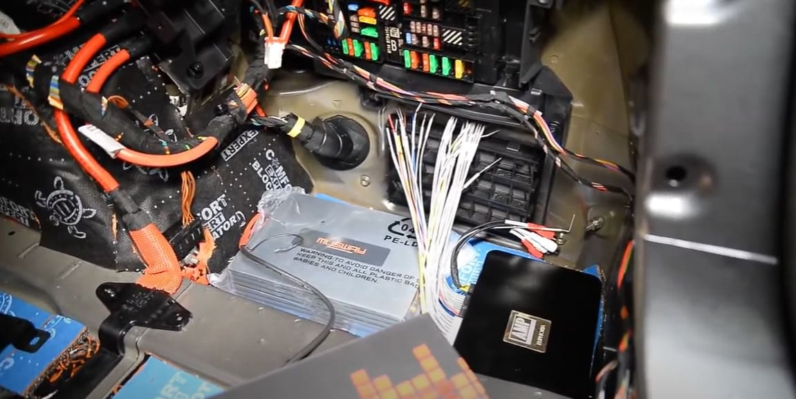 Чтобы справиться с отсутствием низких частот, наши техники монтируют под водительское и переднее пассажирское сиденья мидбасы. Для раскрытия характеристик этого набора мы используем усилитель AMP DA-60.8DSP Euphoria. Его, а также отдельный усилитель для сабвуфера мы расположили в багажном отсеке. Для монтажа максимально используем штатные посадочные места, не прибегая к их доработке.