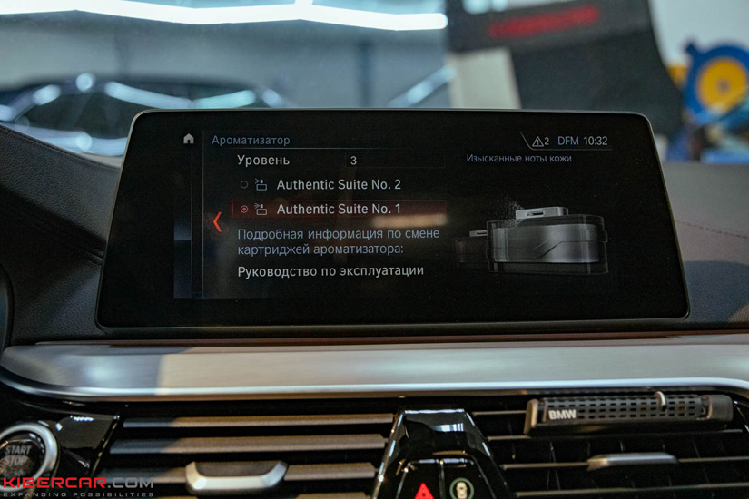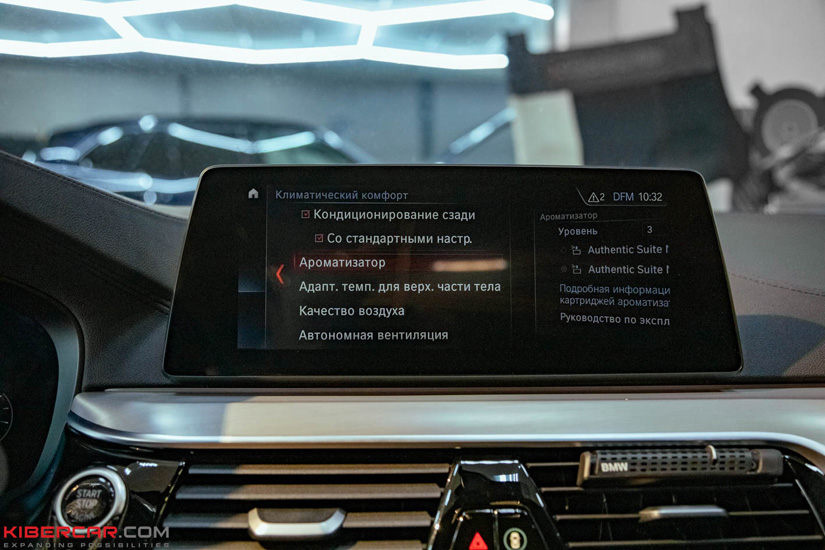 Новое оборудование размещается в бардачке автомобиля. Так как автомобиль BMW 5 G30 получает новую оригинальную опцию, и проводится прошивка головного устройств, управление системой осуществляется со штатного монитора в салоне. Можно настроить работу ароматизатора и включить ионизацию салона.
