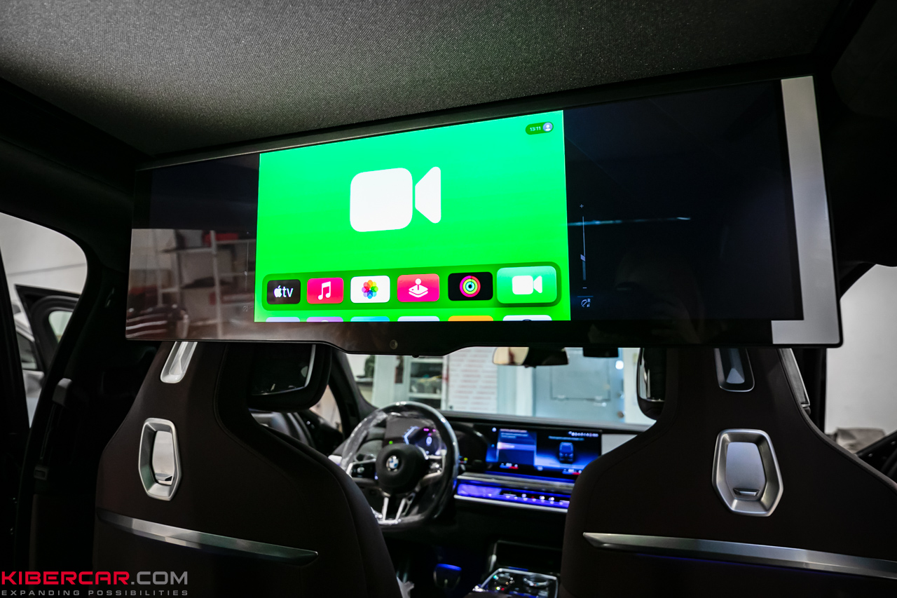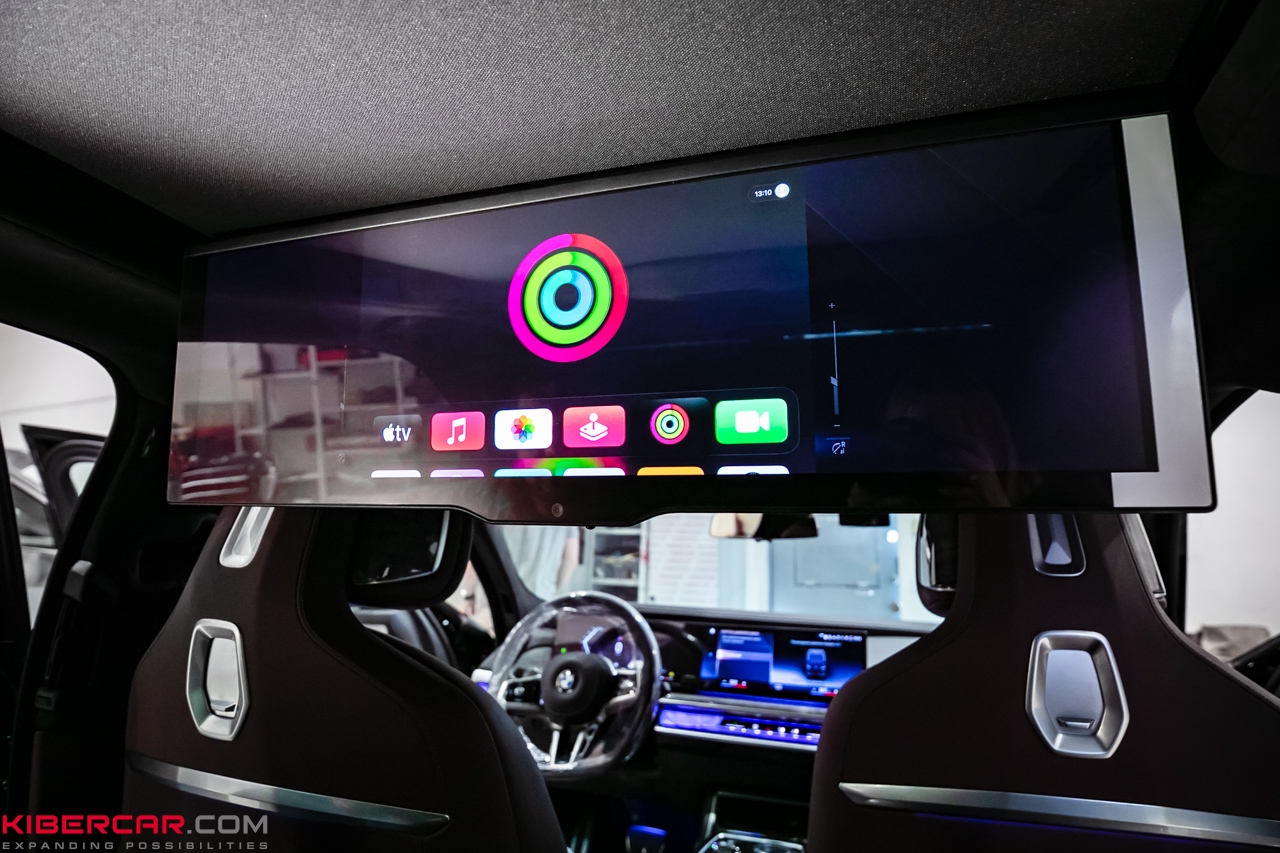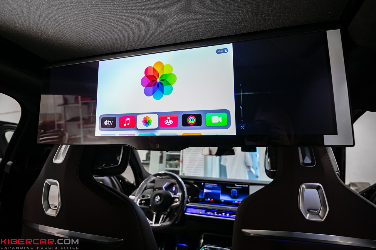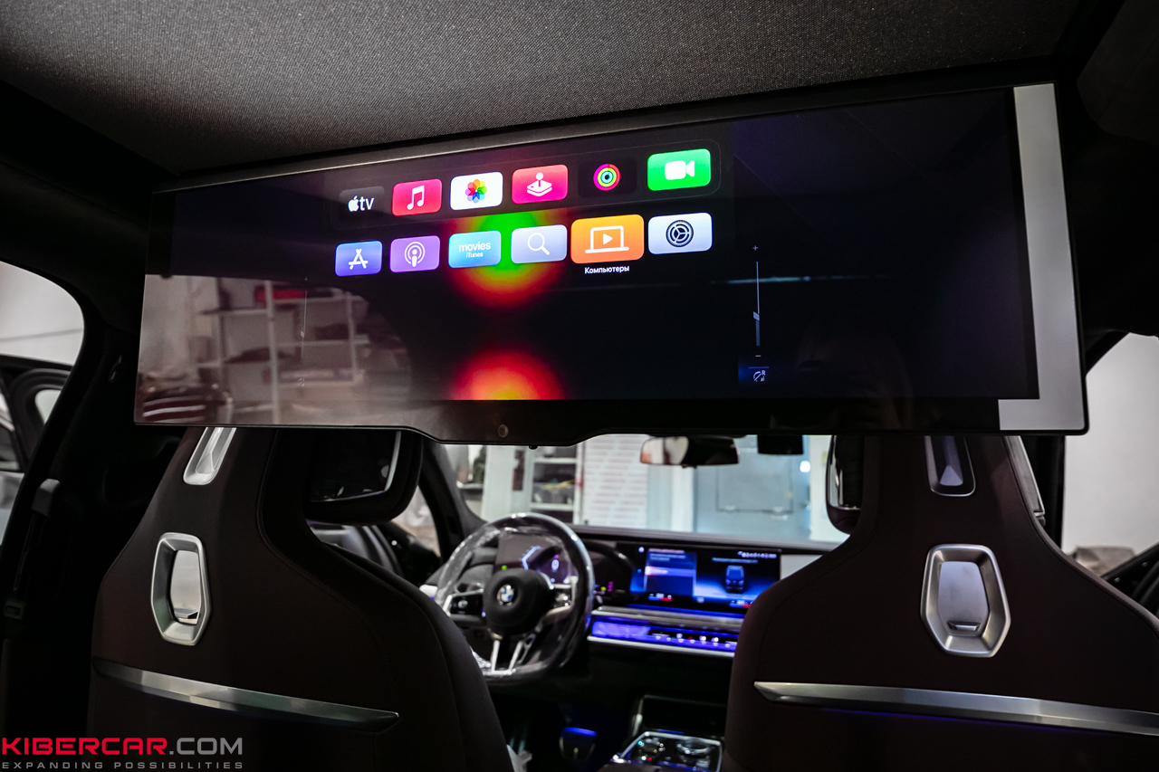 У BMW 7 серии в салоне уже установлен штатный сенсорный монитор, однако владелец пожаловался на недостаточное количество контента. Чтобы решить этот вопрос, наша команда установила приставку Apple TV. Теперь пассажиры заднего ряда могут смотреть контент от Apple на большом потолочном мониторе.