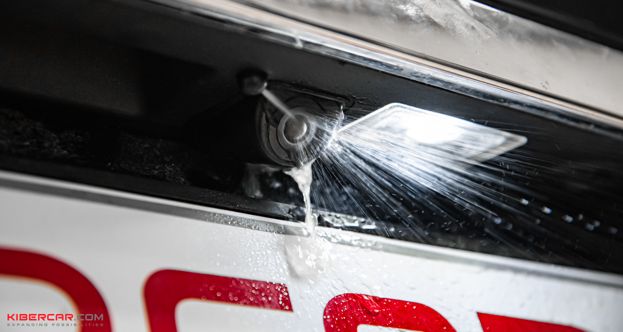 Опытным путем мы установили, что создаваемого штатным моторчиком давления достаточно для качественного смывания грязи с объектива камеры. Вид загрязнений значения не имеет – форсунка справится и с обычной грязью, и с засохшими дорожными реагентами.