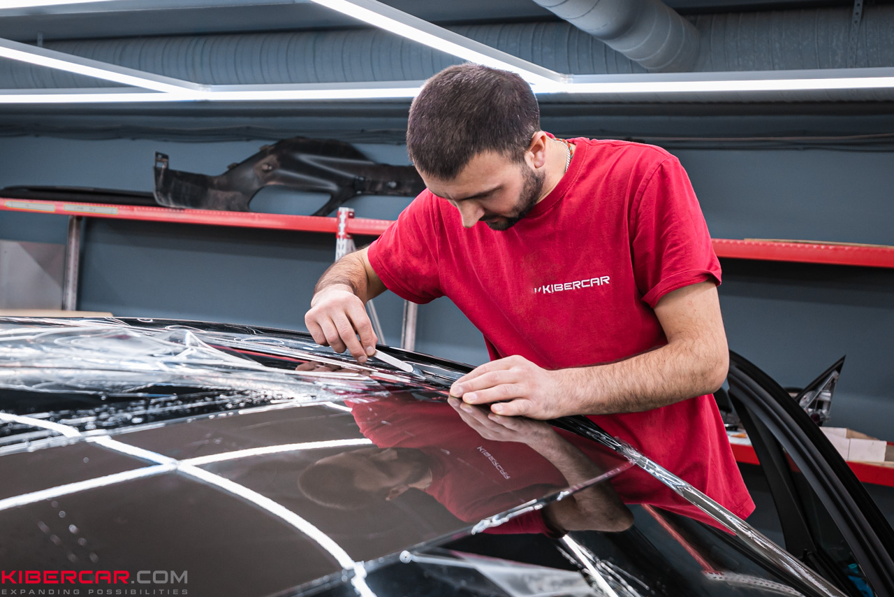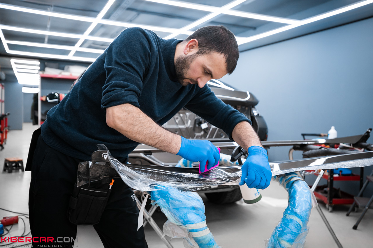 Оклейка производилась «мокрым» способом. Это значит, что перед нанесением отрезка материала его сбрызгивали мыльным раствором. Затем пленка натягивалась на нужный участок, и специальным раствором из-под нее выдавливались остатки раствора. «Мокрый» способ уменьшает вероятность растяжения или деформации материала во время монтажа, а также повреждения лакокрасочного покрытия.