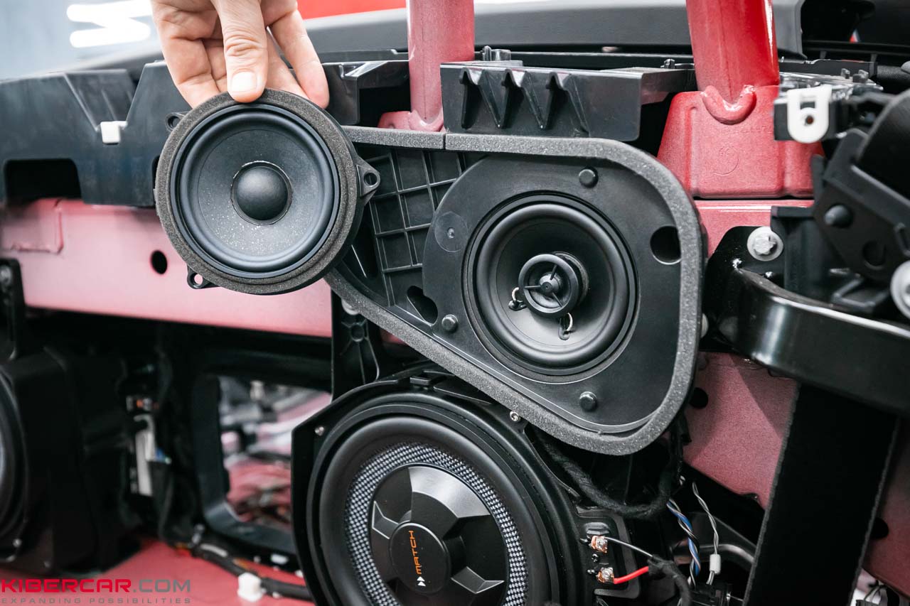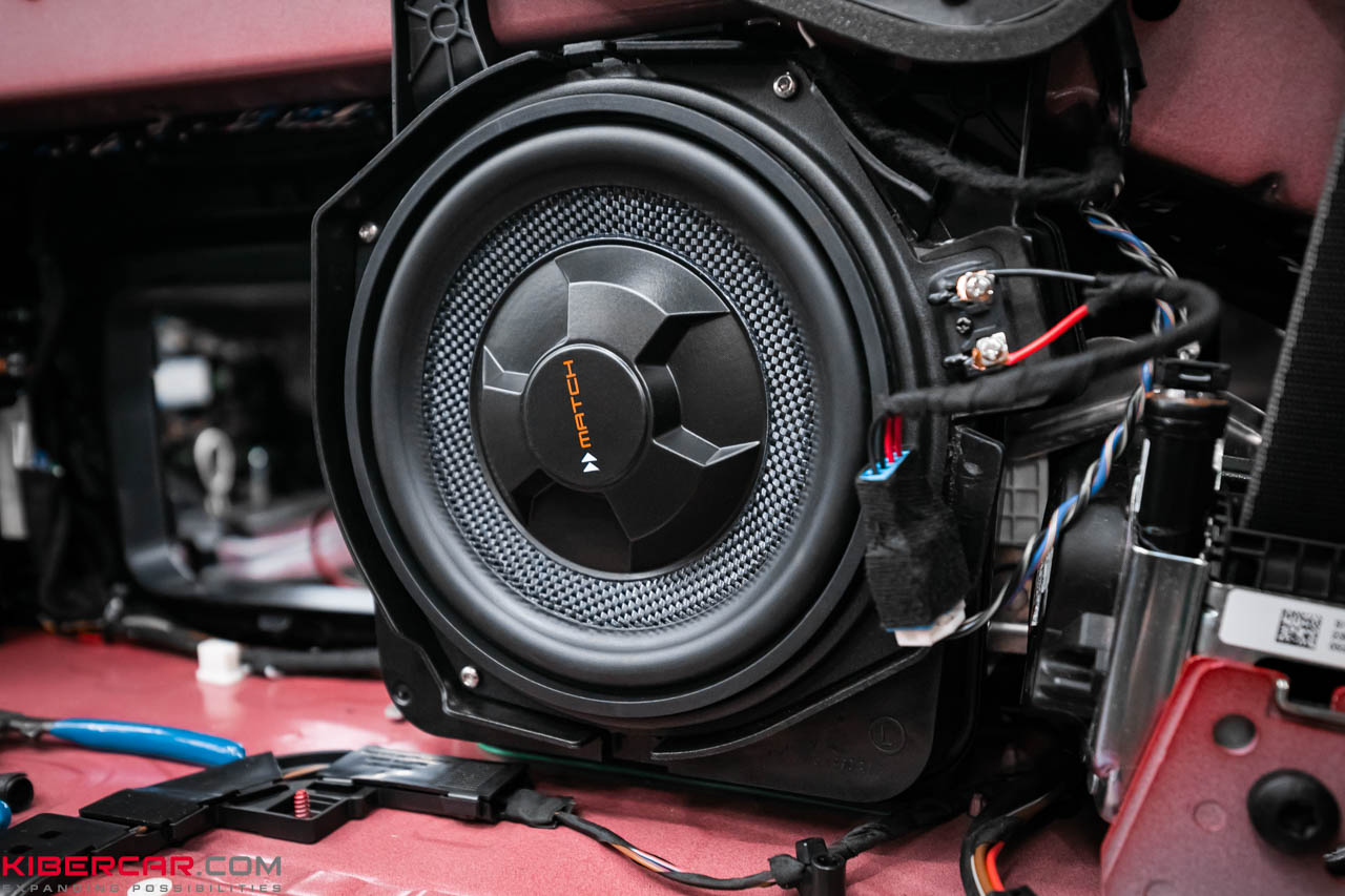 Усилительная часть акустических компонентов MATCH также привлекательна своей компактностью. Мы установили их в штатные места. В передних дверях разместили твитеры и среднечастотные динамики, в торпедо — центральный динамик, в задней крышке — коаксиальную акустику и подседельные динамики, 8-дюймовые вуферы.