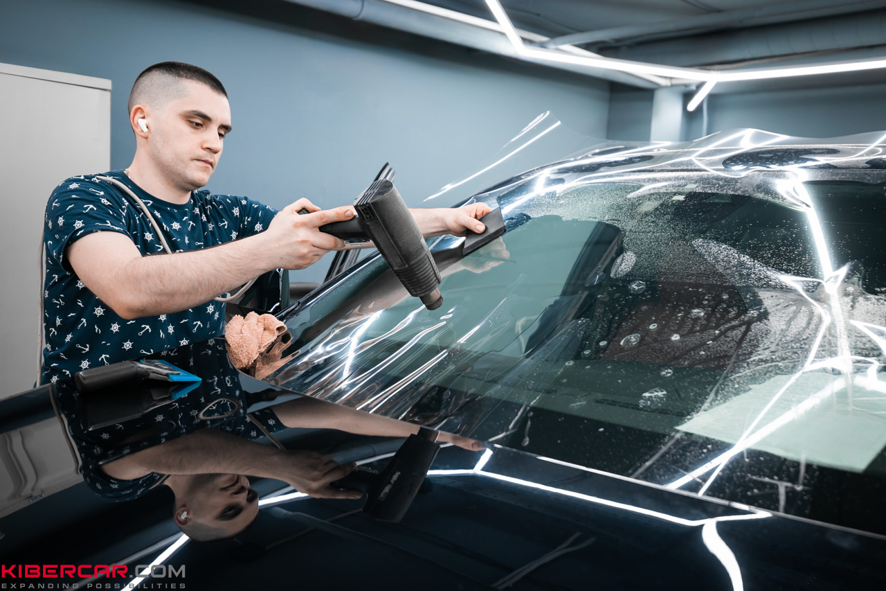 Каждый этап оклейки лобового стекла требует высокой точности и профессионализма. Вначале мы тщательно очистили поверхность стекла от грязи и пыли, обеспечивая идеальное сцепление пленки. Затем, используя специализированные инструменты и технологии, наши мастера аккуратно нанесли бронепленку Clearplex на лобовое стекло Cadillac XT5. Далее идёт выкройка по размерам лобового стекла, мастера аккуратно обрезают лишние куски пленки. Пленка должна осесть не только по размеру, но и по форме стекла – при формовке мастера нагревают пленку специальным оборудованием и «выглаживают» от центра к краю, в вертикальном направлении. На многих автомобилях лобовое стекло выгнутое, и от некорректного нанесения пленка со временем отклеивается в углах. Именно поэтому необходимо обращаться только к профессионалам.