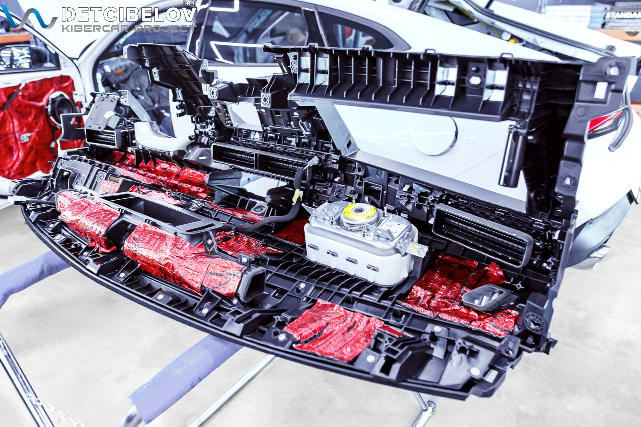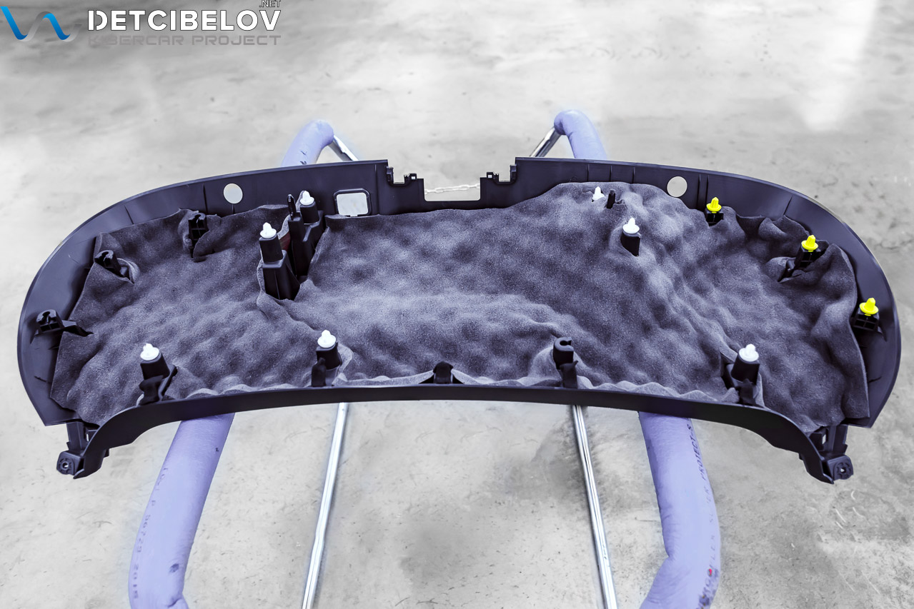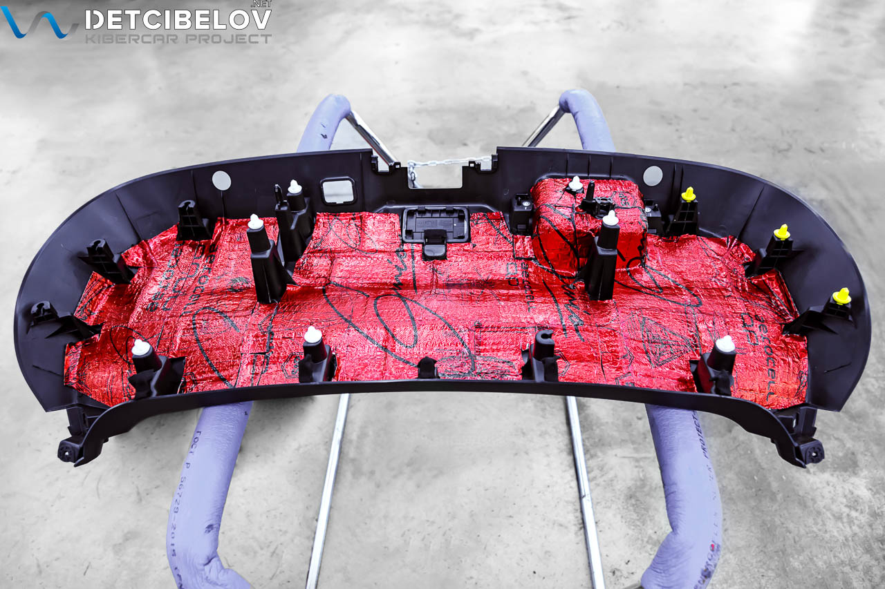 Для шумоизоляции торпедо демонтировали приборную панель, очистили и обезжирили поверхность металла. И только после предварительной подготовки наклеили Aerocell QP Genio (4 мм), а поверх него – Biplast Premium (15 мм). Такая комбинация материалов нейтрализует вибрации и уберет остаточные шумы.