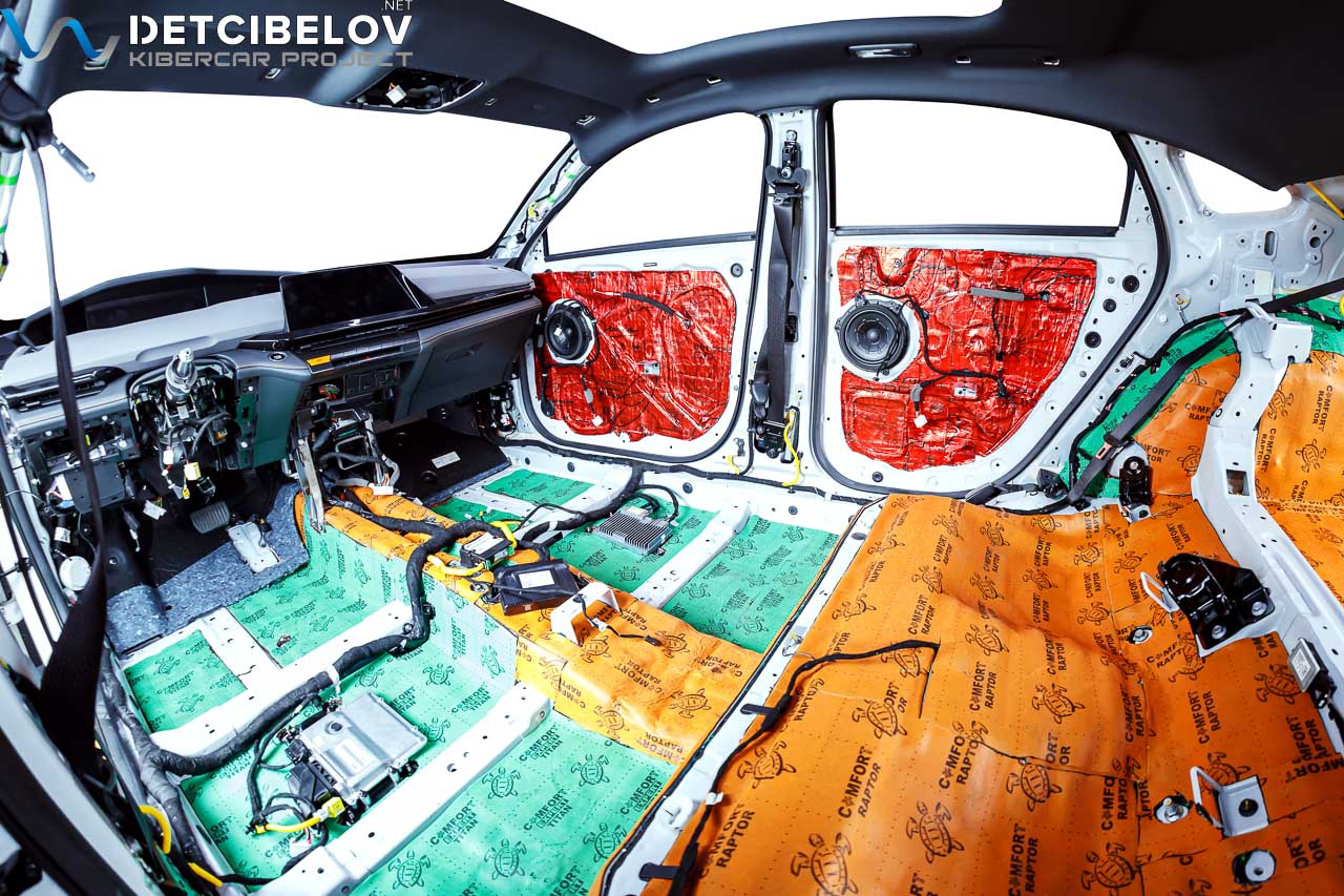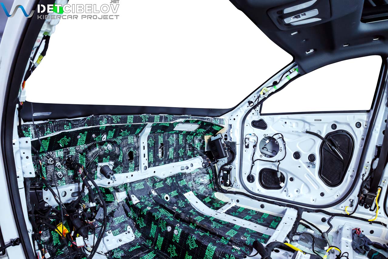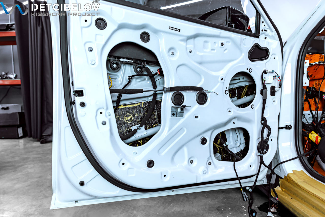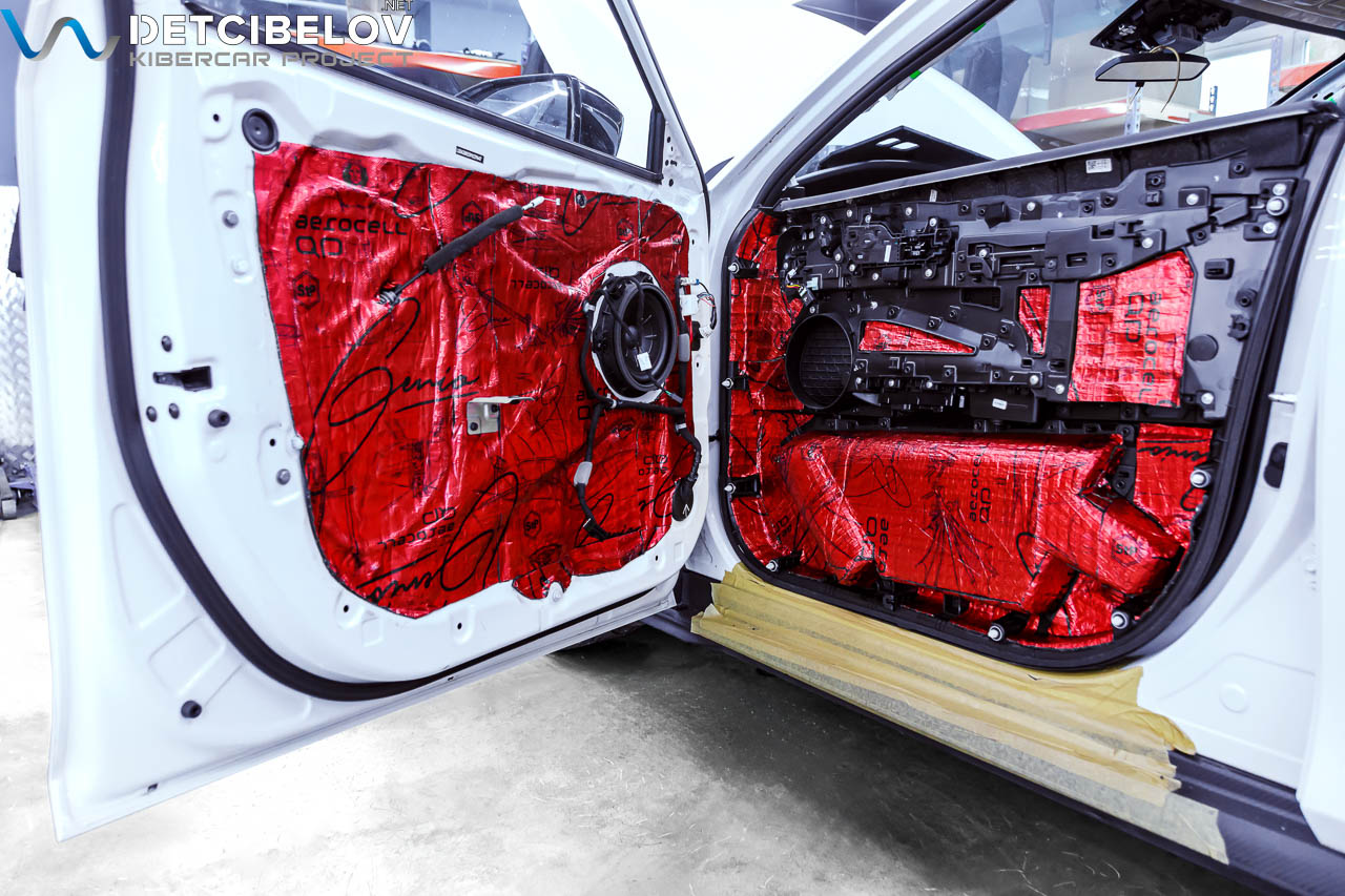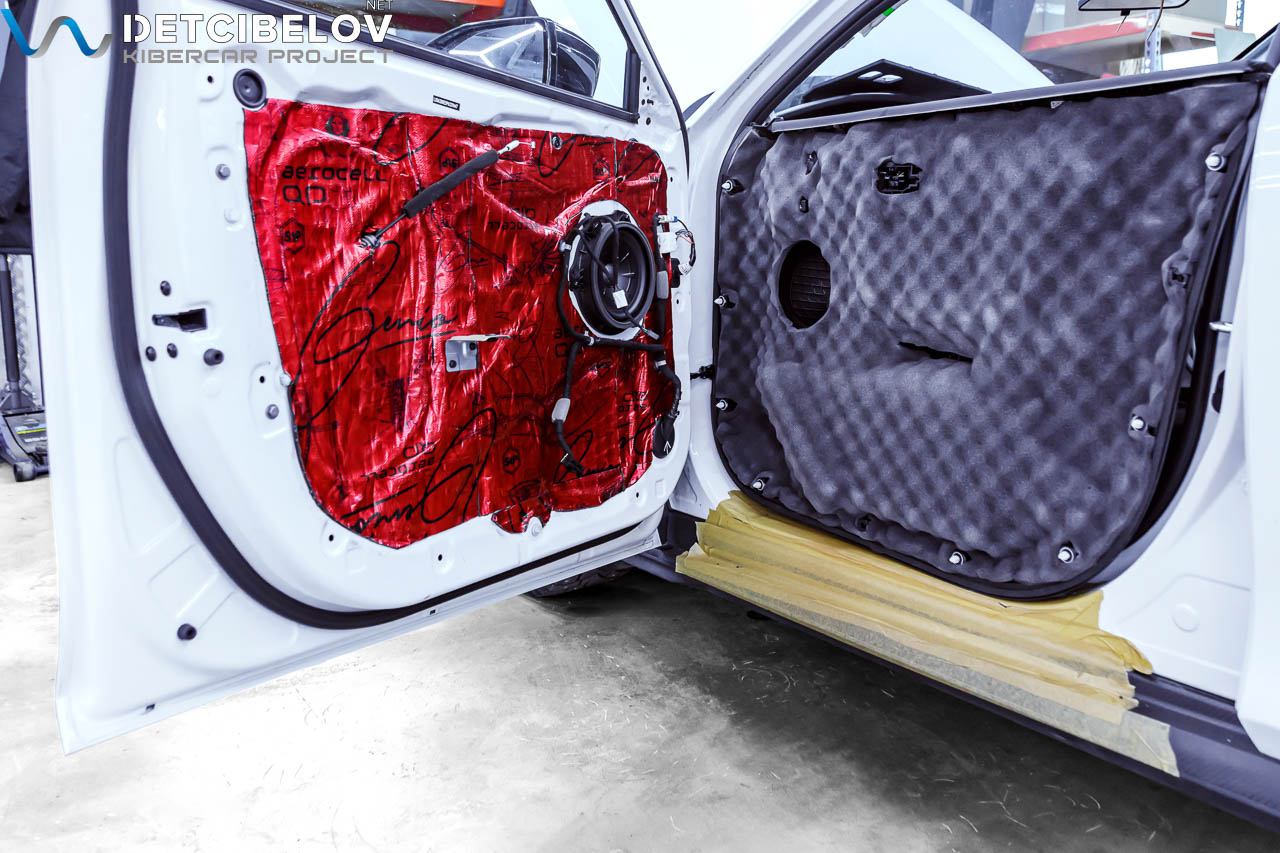 Для начала салон седана освободили от всего лишнего: ковриков, оборудования. На сиденья надели специальные чехлы, пороги и дверные арки заклеили малярным скотчем. Сняли дверную обшивку, обезжирили поверхность и наклеили слой Aerocell QP Intrigo (6 мм) – материал с инновационными гранулами Aerocell, который эффективно блокирует распространение вибраций и шума. Поверх этого слоя наклеили StP Biplast Premium (15 мм) с шумопоглощающими свойствами. В качестве третьего слоя использовали Aerocell QP Genio (4 мм), его же наклеили на карты дверей. А для еще большего шумопоглощения использовали материал на основе вспененного полиуретана Comfort mat Wave Expert (15 мм), объемный и легкий.