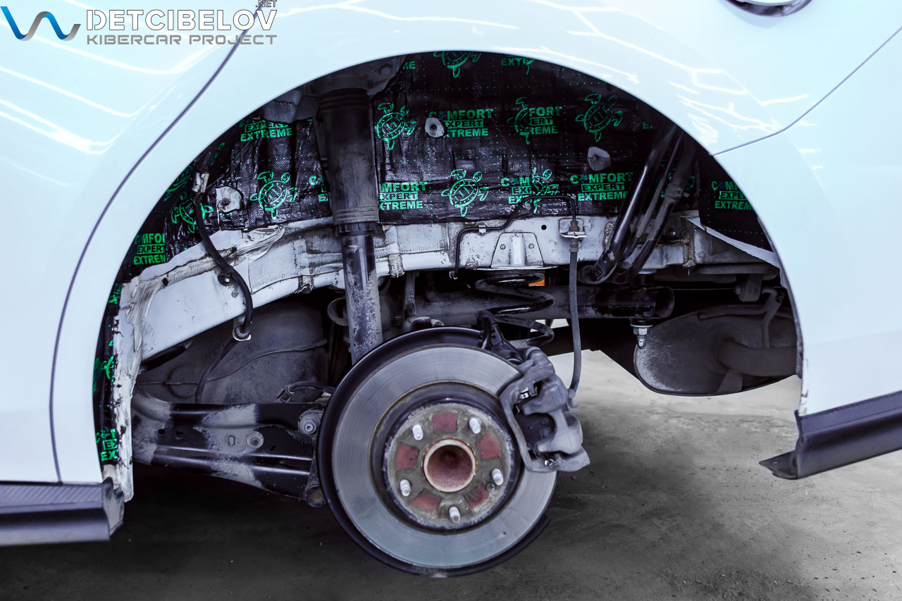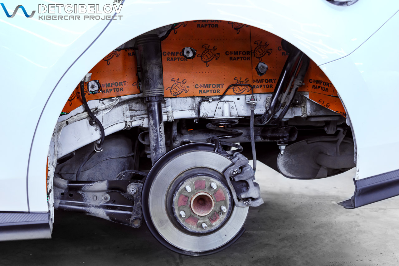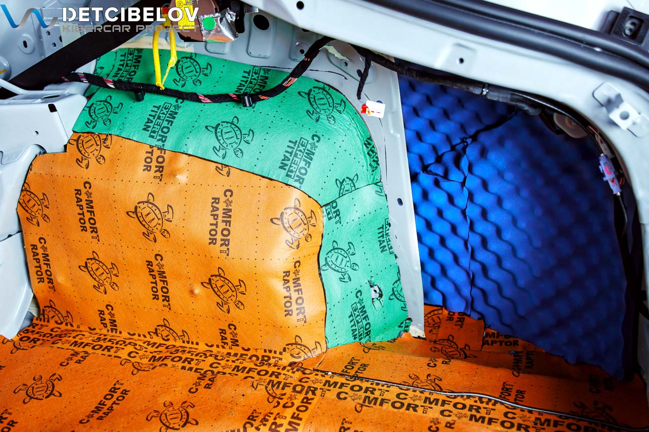 Для шумоизоляции пола использовали комплекс материалов. На полу в передней части салона наклеили Comfort mat Titan (8 мм), в задней части и на полу в багажнике – Comfort mat Extreme (3,5 мм). Внутренние арки оклеили материалом Aerocell QP Intrigo (6 мм). Основная функция нижнего слоя – защита от вибраций.