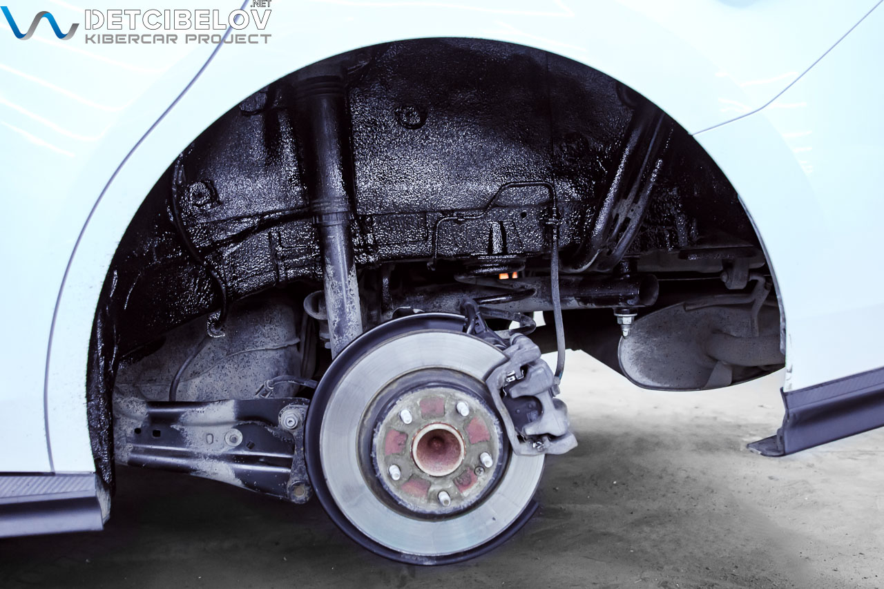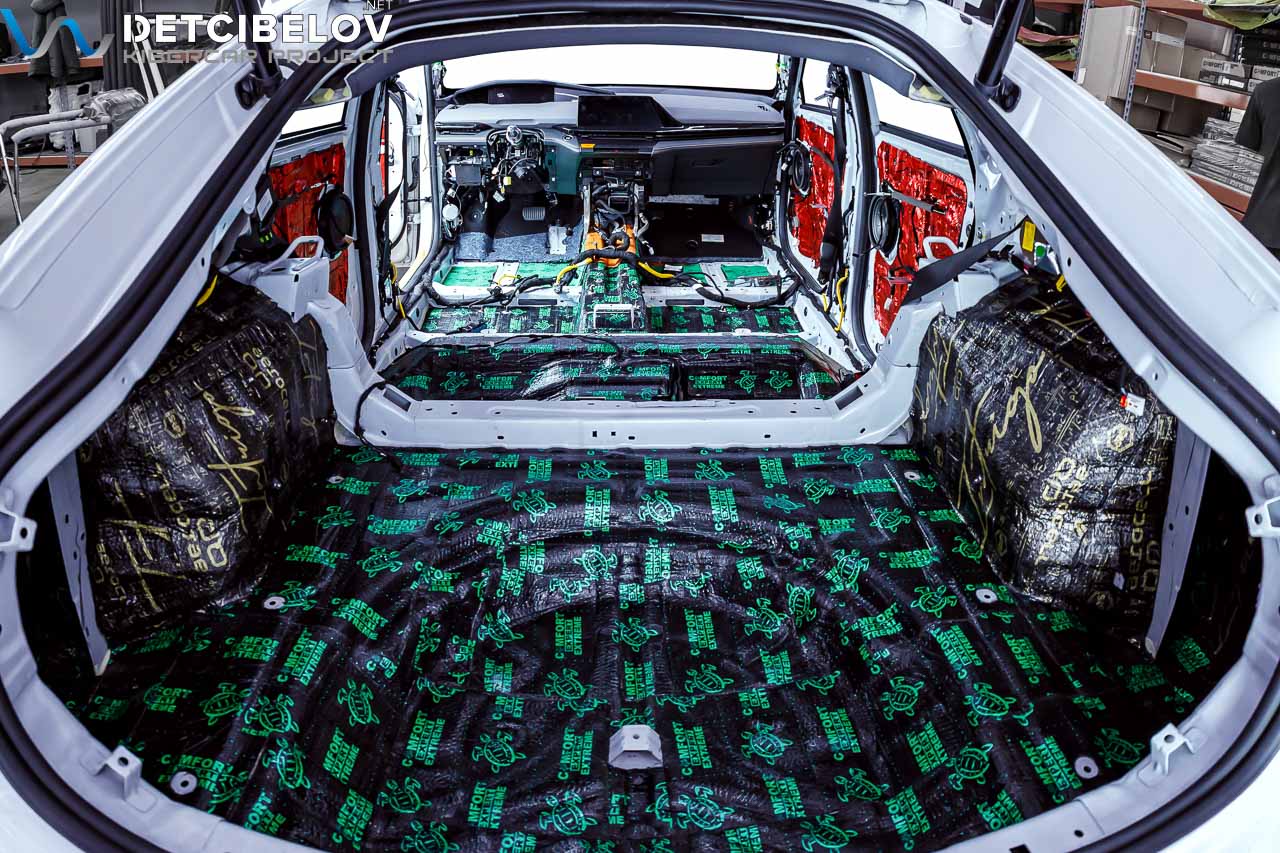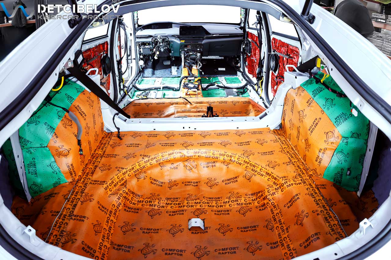Для шумоизоляции пола использовали комплекс материалов. На полу в передней части салона наклеили Comfort mat Titan (8 мм), в задней части и на полу в багажнике – Comfort mat Extreme (3,5 мм). Внутренние арки оклеили материалом Aerocell QP Intrigo (6 мм). Основная функция нижнего слоя – защита от вибраций.