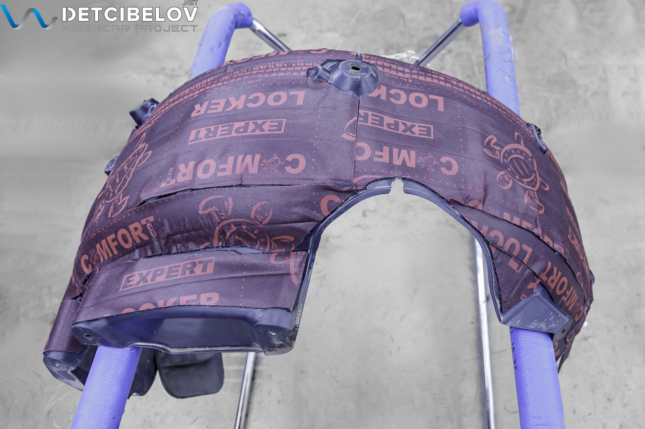 Вторым слоем наклеили материалы, отвечающие за шумопоглощение. На полу в салоне и верхней части внутренних арок использовали Comfort mat Titan (8 мм), акустическую мембрану со звуко- и теплоизолирующим слоем. На полу под задними сиденьями, в багажнике и на внутренних арках использовали Comfort mat Raptor (4 мм). Для шумоизоляции крыльев выбрали StP Biplast Premium (15 мм) – материал на основе вспененного полиуретана.