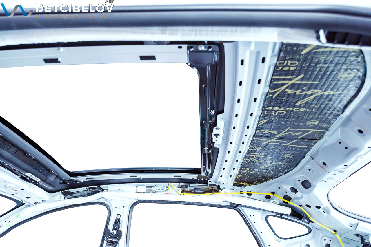 Обшивку крыши сняли максимально аккуратно, в одноразовых перчатках. Оголившийся металл обезжирили и наклеили слой Aerocell QP Intrigo (6 мм) для защиты от низкочастотных структурных шумов и вибраций. Он также обеспечивает дополнительную защиту участка от коррозии.