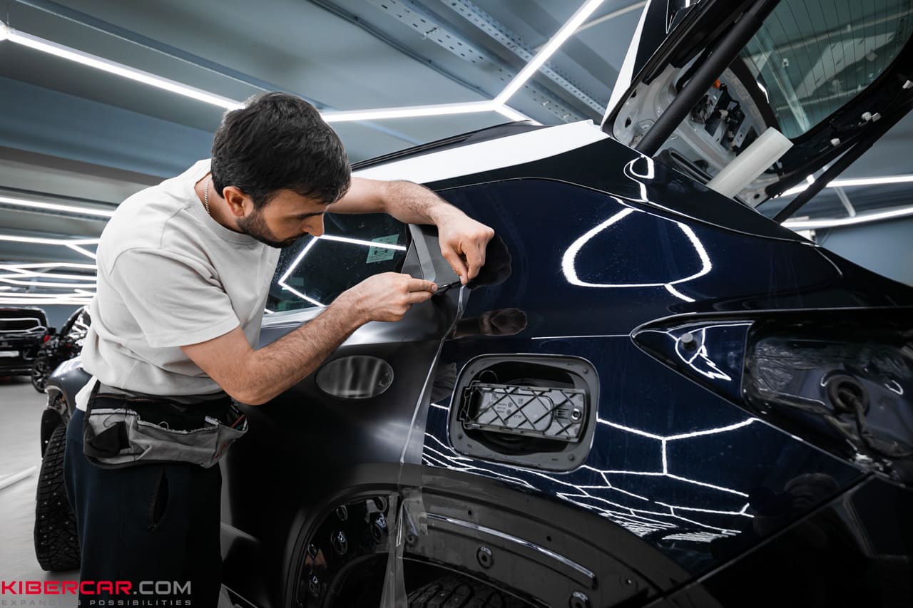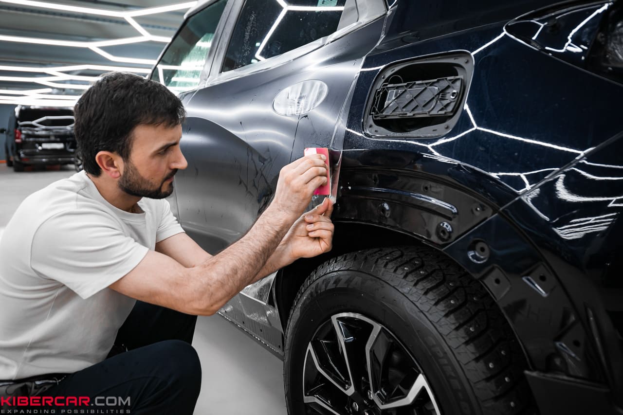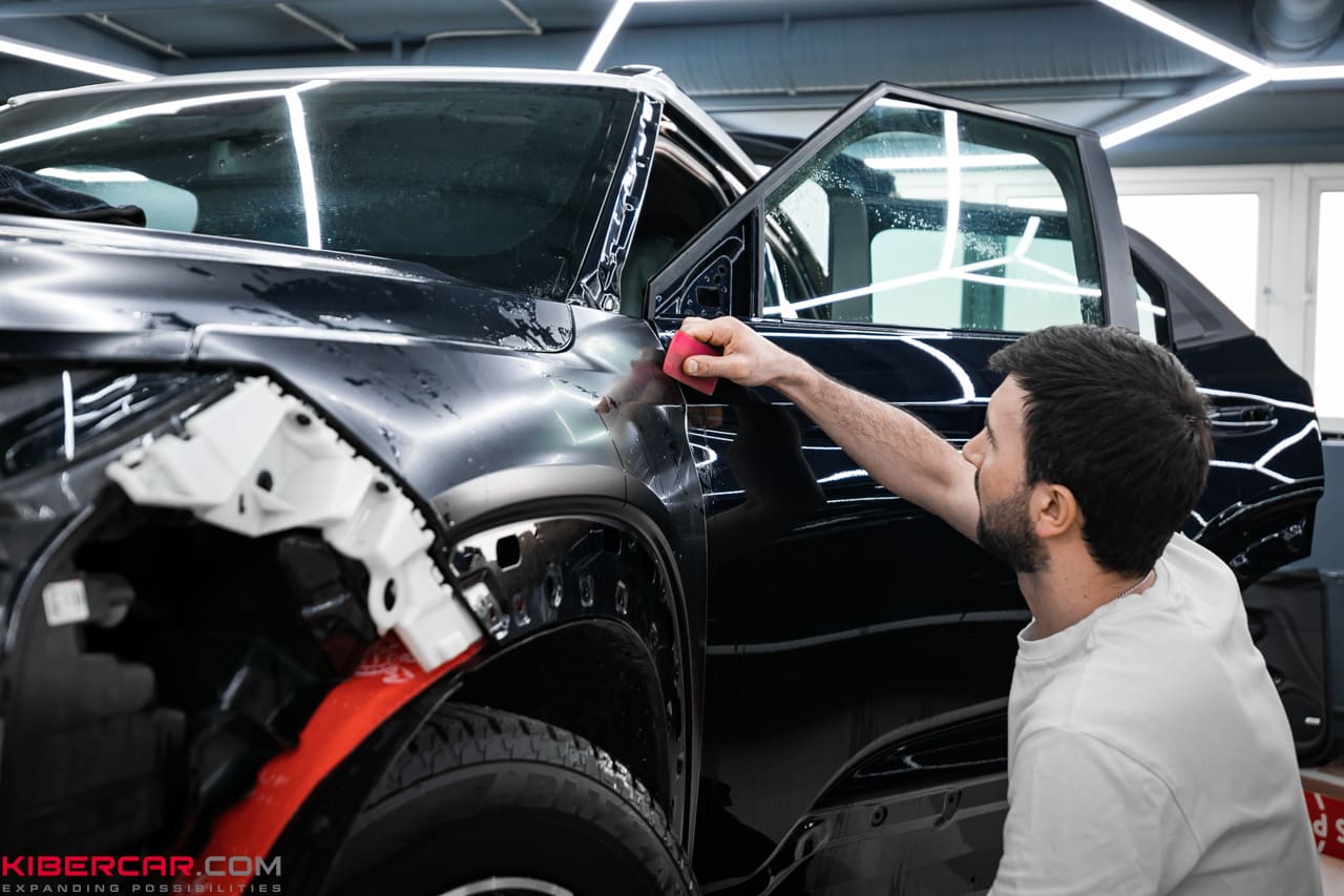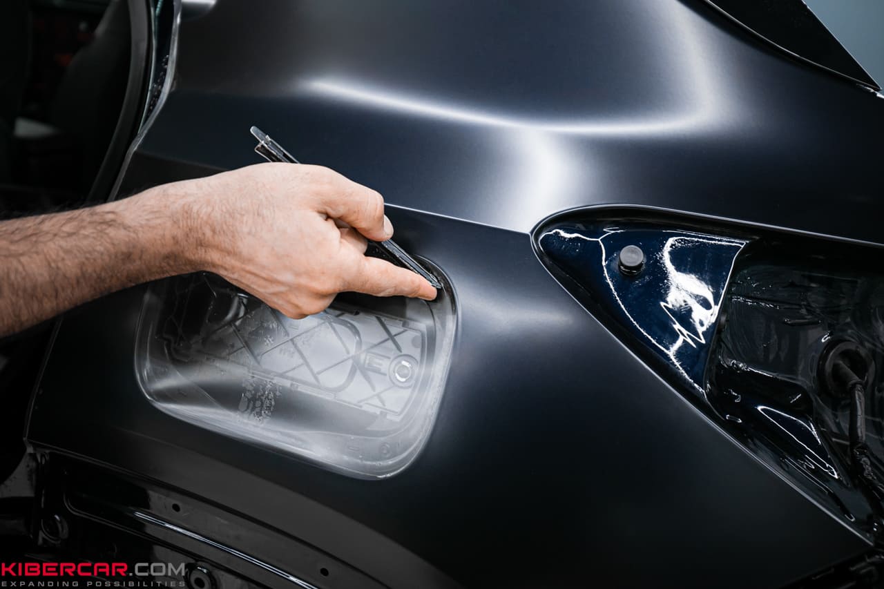 5. Далее мастера поэлементно нарезают пленку, смачивают деталь автомобиля специальным раствором на основе воды и мыла, затем наносят мокрую пленку на поверхность. Пленка должна быть немного больше детали, чтобы ее можно было натянуть, аккуратно подрезать и загнуть по краям. Это обязательное условие, поскольку каждый элемент должен быть «с подворотом», чтобы обеспечить надежную фиксацию пленки на много лет вперёд. Мастера компании КИБЕРКАР режут плёнку не касаясь металла, ведь если резать иначе, можно повредить ЛКП и резиновые уплотнители, испортить покрытие вплоть до перекраса.