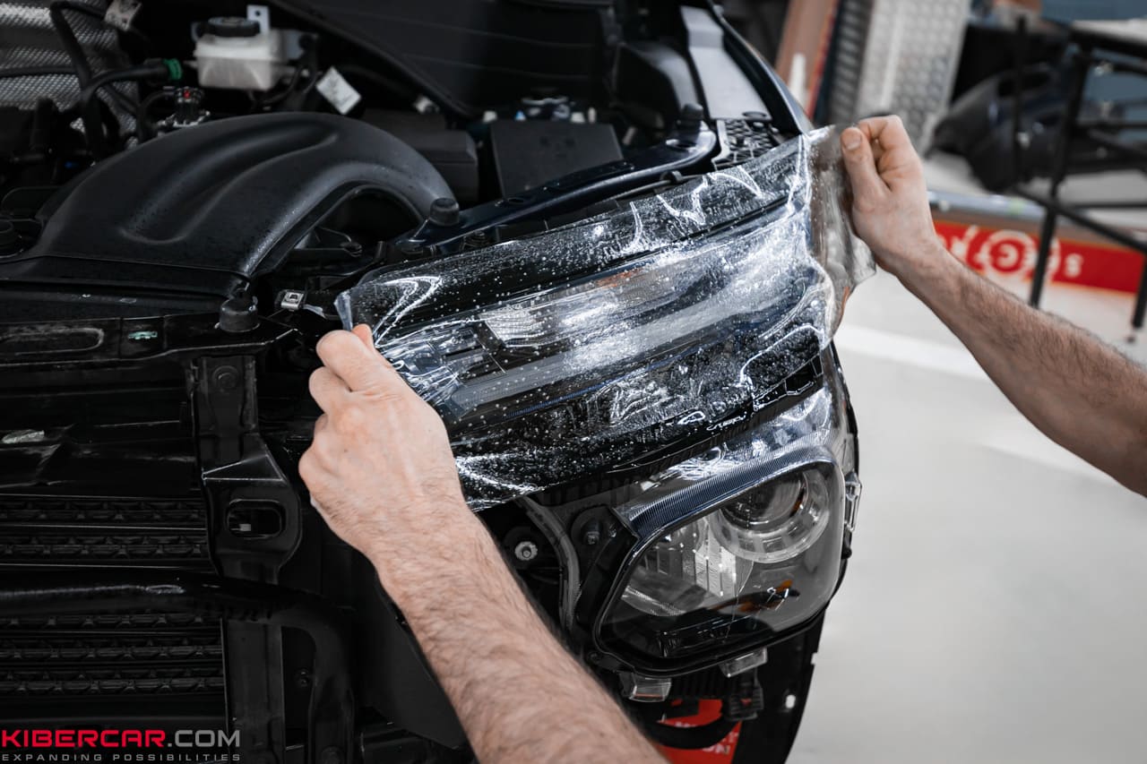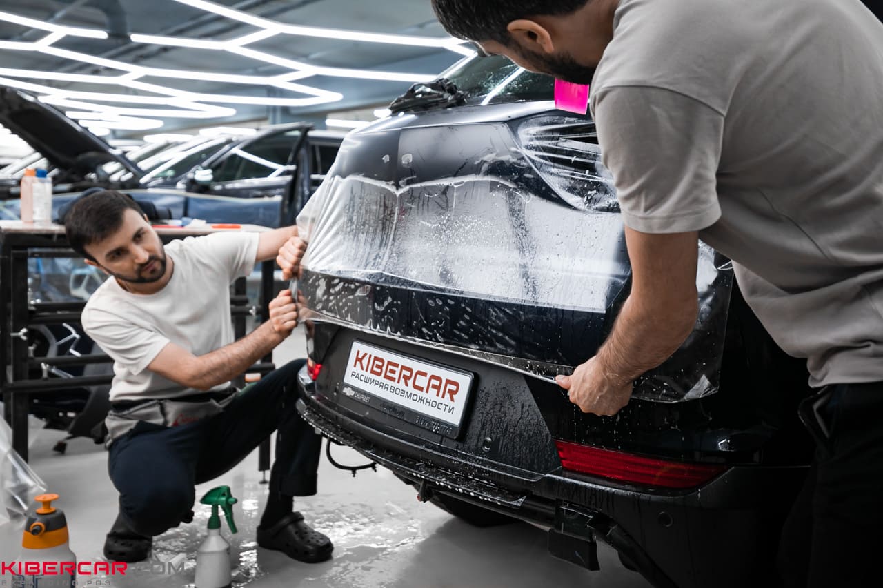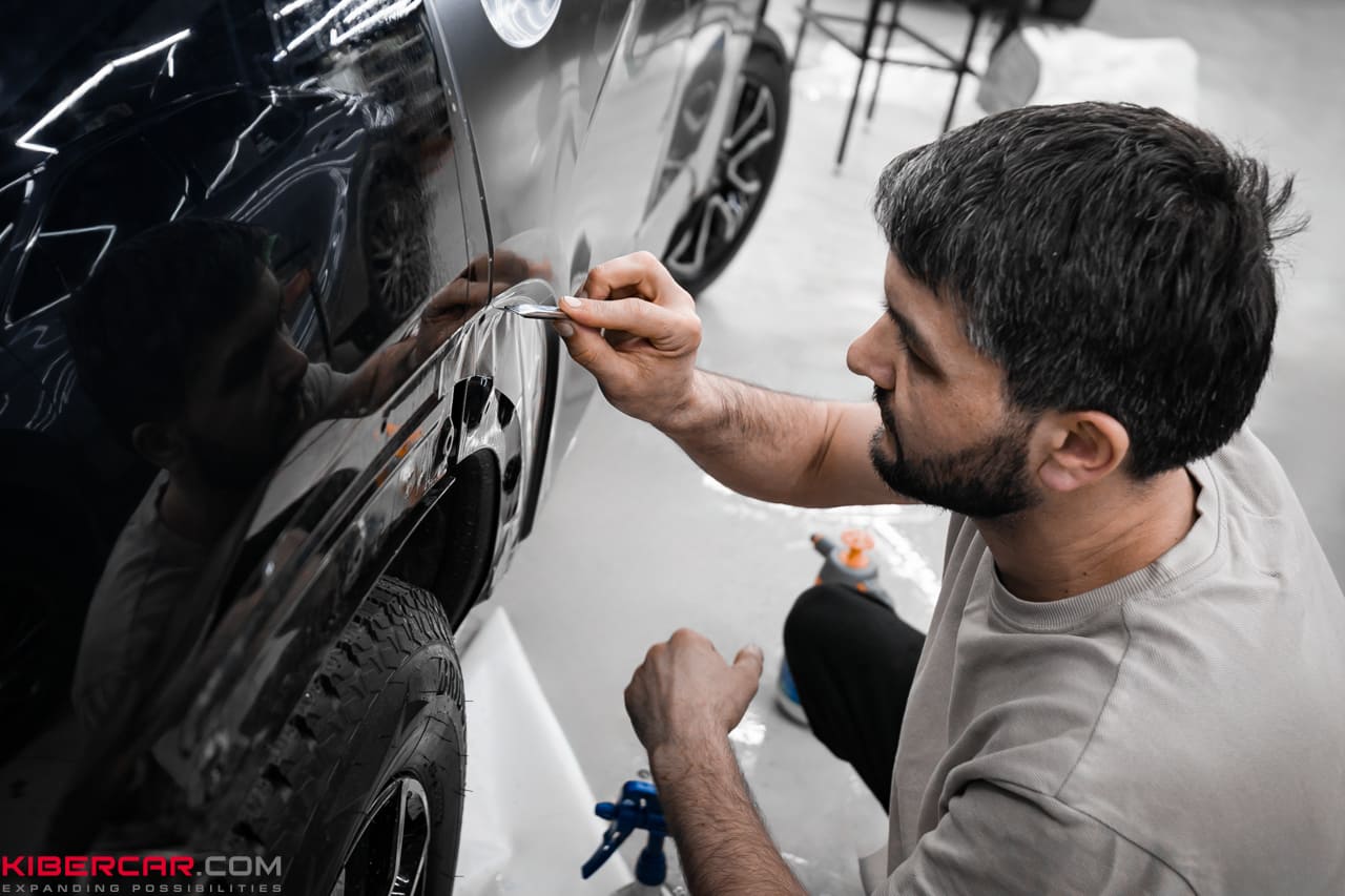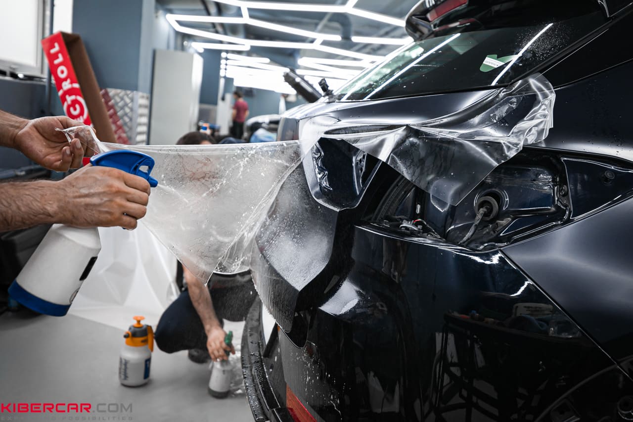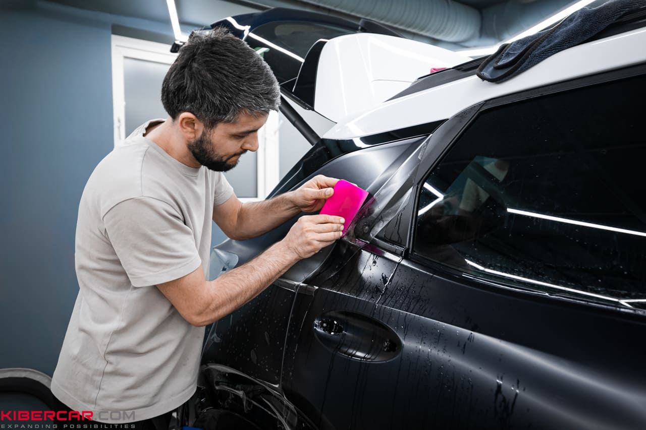 5. Далее мастера поэлементно нарезают пленку, смачивают деталь автомобиля специальным раствором на основе воды и мыла, затем наносят мокрую пленку на поверхность. Пленка должна быть немного больше детали, чтобы ее можно было натянуть, аккуратно подрезать и загнуть по краям. Это обязательное условие, поскольку каждый элемент должен быть «с подворотом», чтобы обеспечить надежную фиксацию пленки на много лет вперёд. Мастера компании КИБЕРКАР режут плёнку не касаясь металла, ведь если резать иначе, можно повредить ЛКП и резиновые уплотнители, испортить покрытие вплоть до перекраса.