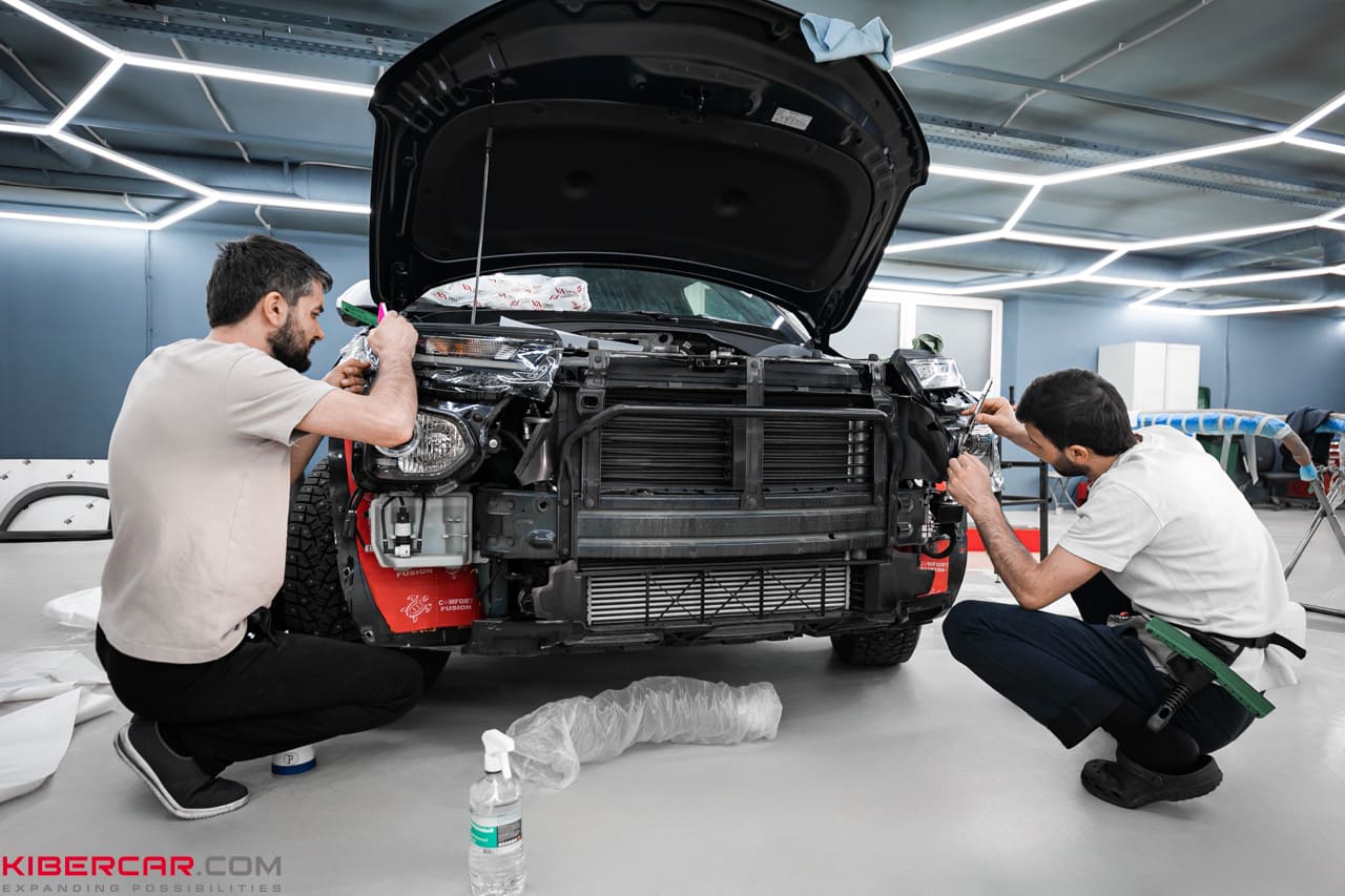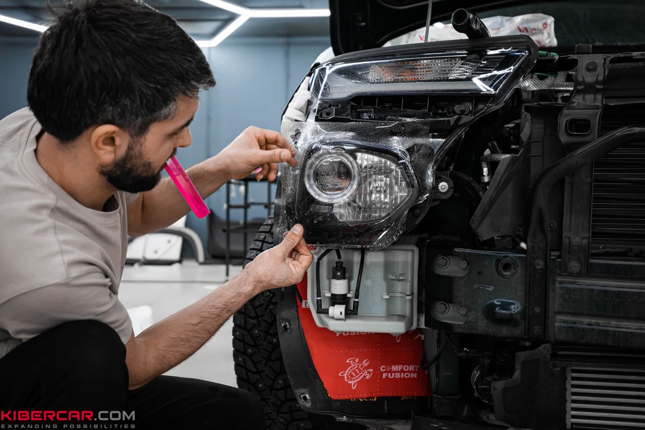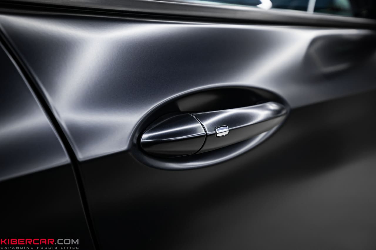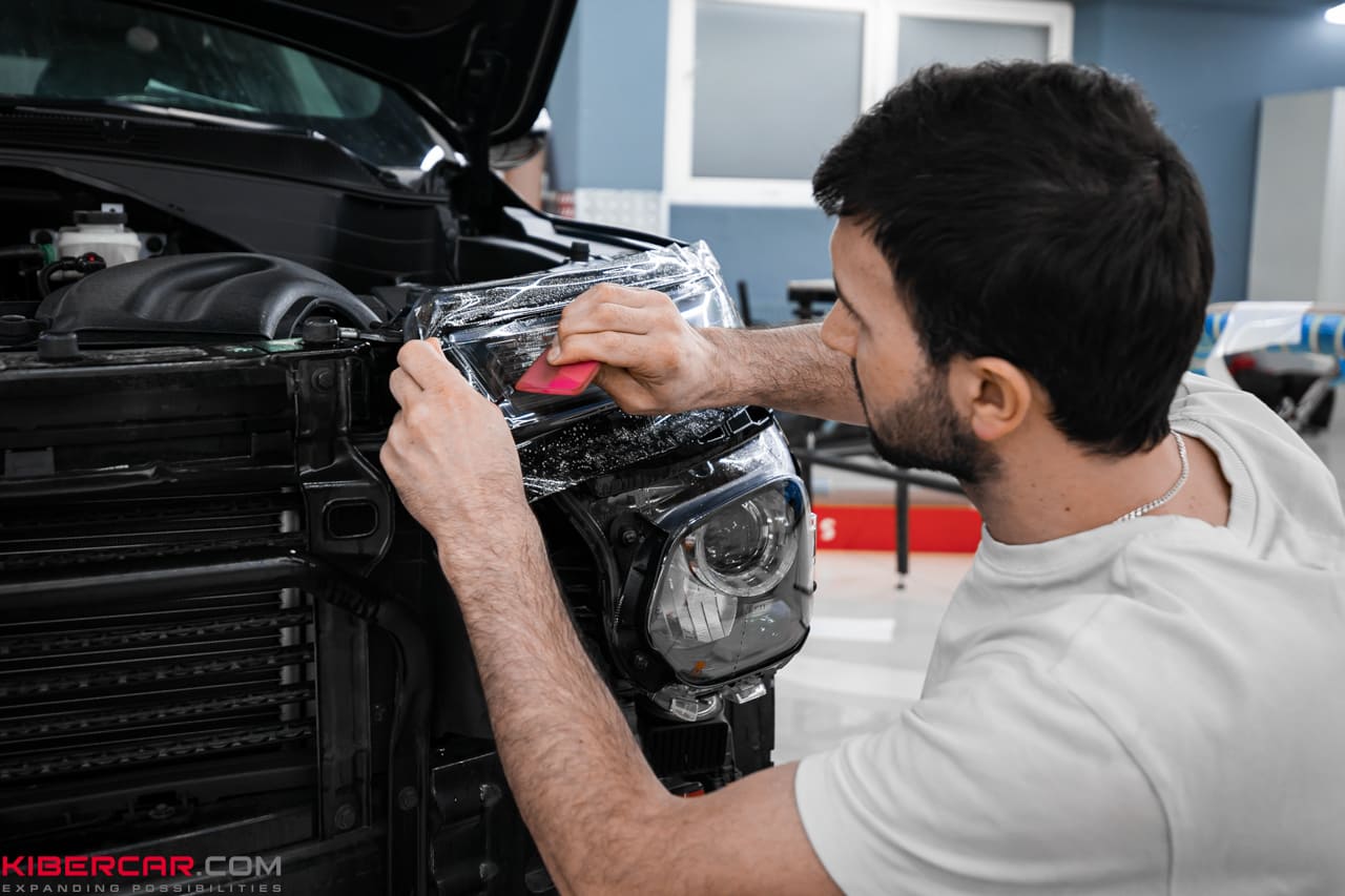 5. Далее мастера поэлементно нарезают пленку, смачивают деталь автомобиля специальным раствором на основе воды и мыла, затем наносят мокрую пленку на поверхность. Пленка должна быть немного больше детали, чтобы ее можно было натянуть, аккуратно подрезать и загнуть по краям. Это обязательное условие, поскольку каждый элемент должен быть «с подворотом», чтобы обеспечить надежную фиксацию пленки на много лет вперёд. Мастера компании КИБЕРКАР режут плёнку не касаясь металла, ведь если резать иначе, можно повредить ЛКП и резиновые уплотнители, испортить покрытие вплоть до перекраса.