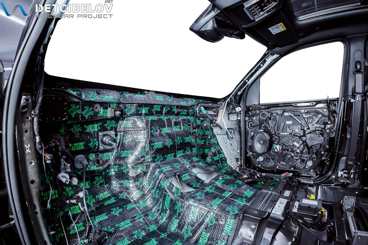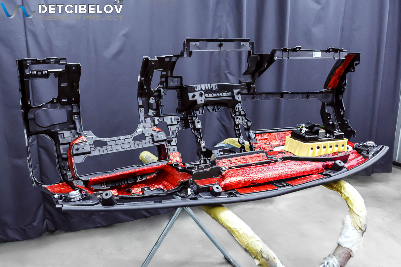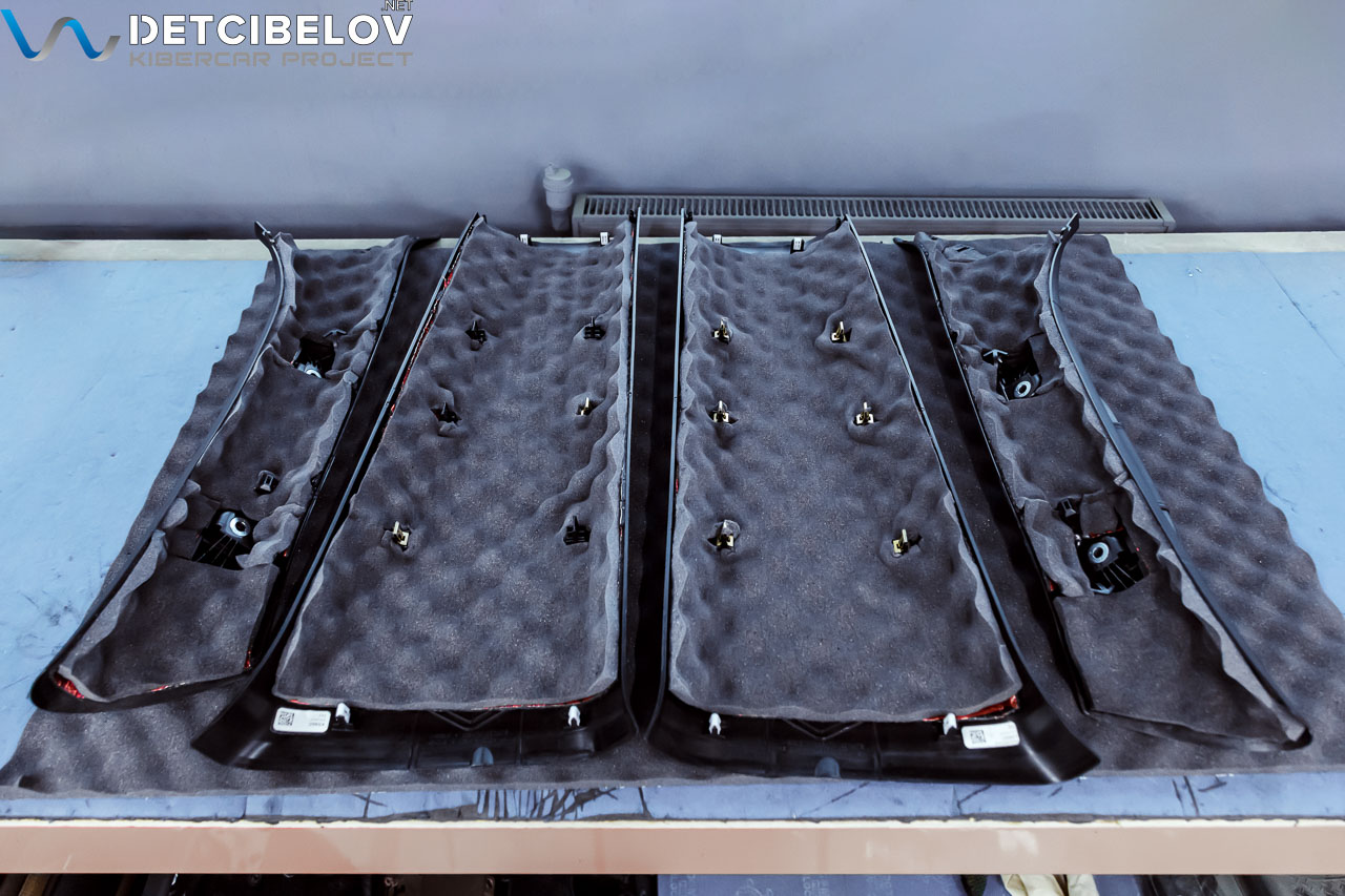 Для проведения капсульной шумоизоляции команда полностью разбирает обшивку, убирает все дополнительное оборудование и пластиковые детали. Затем мы обезжириваем металл и последовательно, слой за слоем, наносим шумоизоляцию. Для таких проектов используем более 10 разных видов материалов, которые выполняют функции вибродемпферов, уплотнителей, шумопоглотителей, звукоизоляционных мембран. Это материалы Aerocell QP, Genio, Aerocell QP Intrigo, Bromo, Biplast Premium и другие. При укладке мы придерживаемся рекомендаций производителя, завода Стандартпласт.