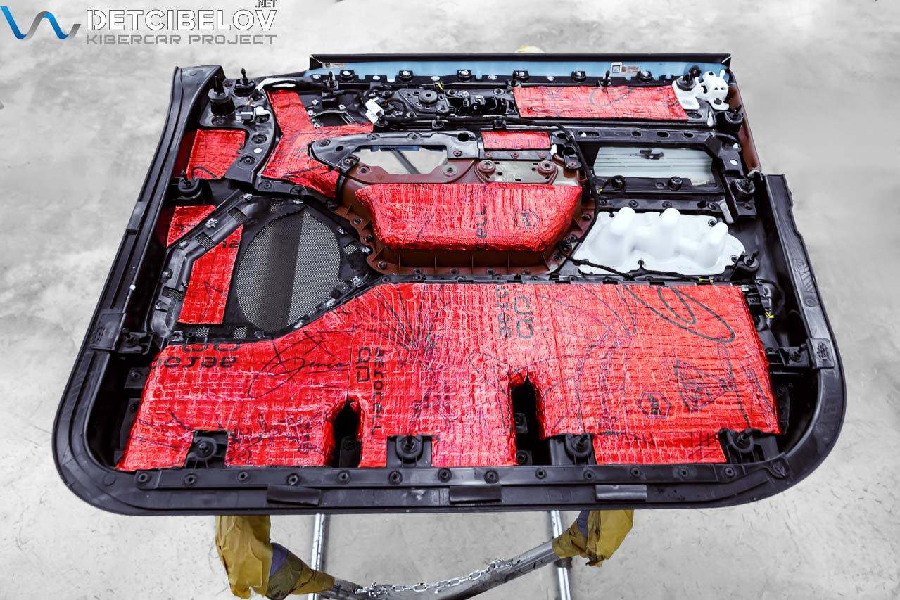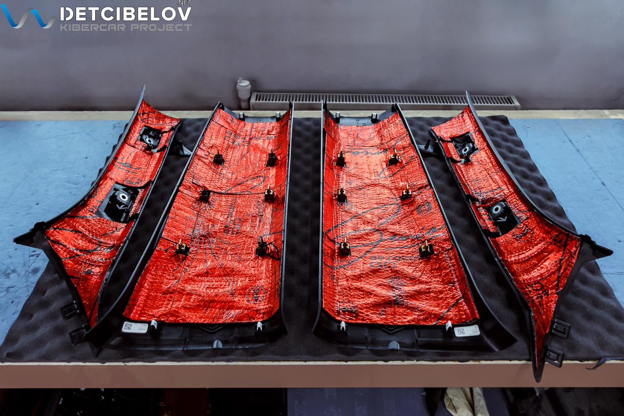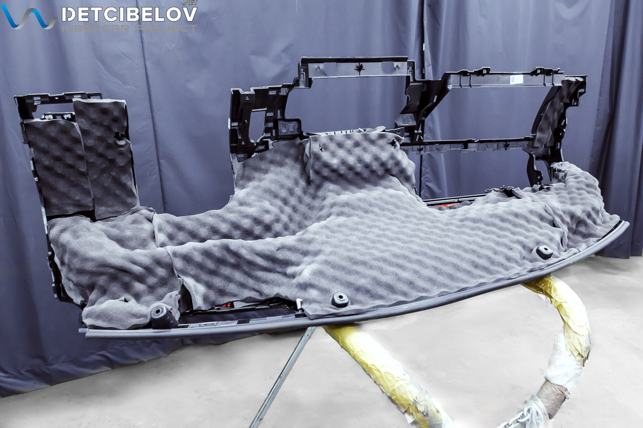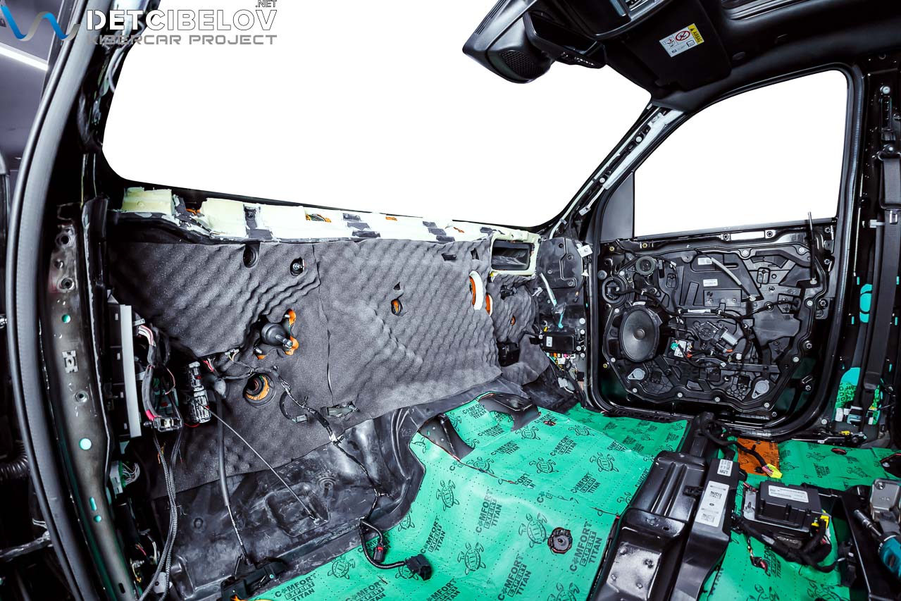 Для проведения капсульной шумоизоляции команда полностью разбирает обшивку, убирает все дополнительное оборудование и пластиковые детали. Затем мы обезжириваем металл и последовательно, слой за слоем, наносим шумоизоляцию. Для таких проектов используем более 10 разных видов материалов, которые выполняют функции вибродемпферов, уплотнителей, шумопоглотителей, звукоизоляционных мембран. Это материалы Aerocell QP, Genio, Aerocell QP Intrigo, Bromo, Biplast Premium и другие. При укладке мы придерживаемся рекомендаций производителя, завода Стандартпласт.