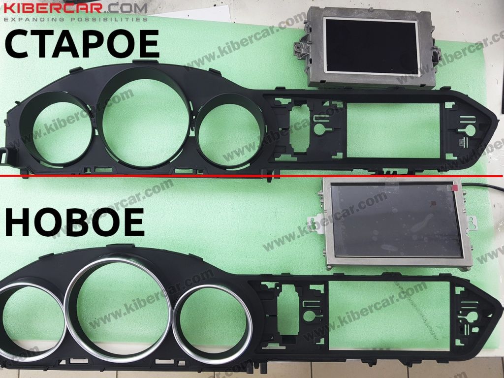 Для начала установщики сняли приборную панель, дабы добраться до штатного головного устройства и произвести внедрение блока AirTouch Performance, о котором чуть ниже. Саму панель мы поменяли на новую, где надежно закрепили свежеустановленный экран. Можно обратить внимание на размер старого монитора и нового на фото ниже. Размер здесь определенно добавит контраста в салон автомобиля.