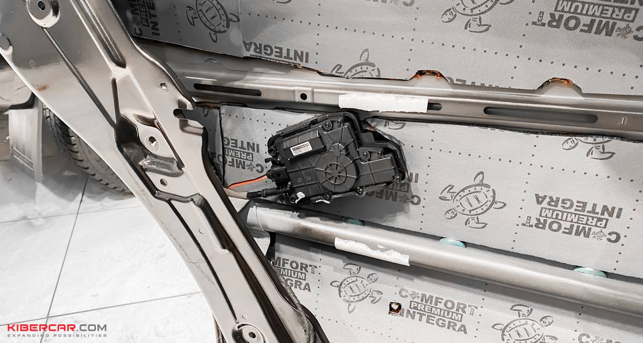 Мы установили комплект доводчиков пластинного типа, разработанный инженерами SmartGear. Процесс работы начинается с того, что мы разобрали двери и сняли карту. Далее монтируется шумоизоляция, устанавливается мотор-редуктор, который соединяется тросом с пластиной, изготовленной из прочных марок стали на высокоточных станках с ЧПУ.