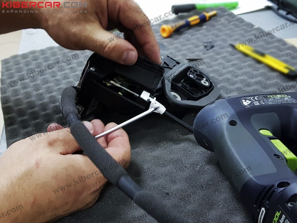 Сперва мастер снимает обшивку дверей, снимает ручки и демонтирует штатные замки.