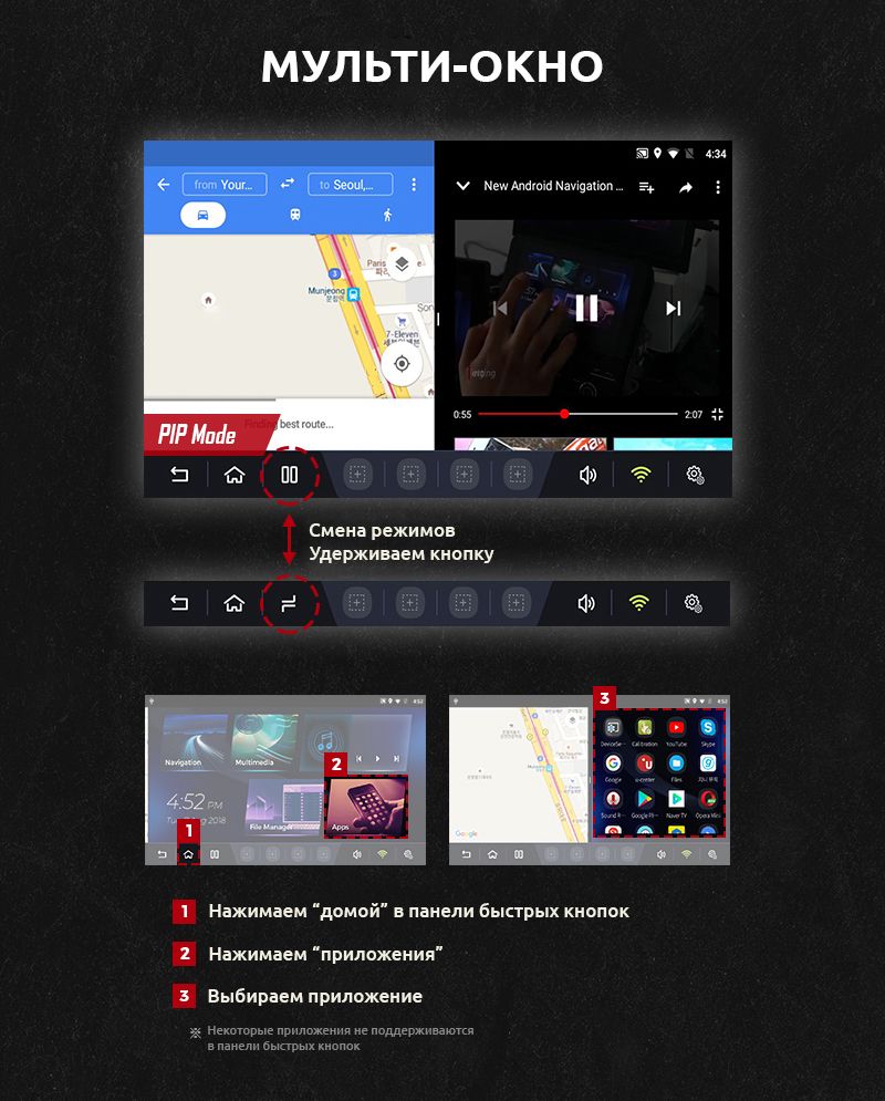 Полезная функция «мульти-окно», которое включается 1 нажатием. Разместив на 1 экране сразу 2 навигатора, Анти-радар + навигатор или навигатор + ютуб, клиент получит то, что и хотел – индивидуальный подход.