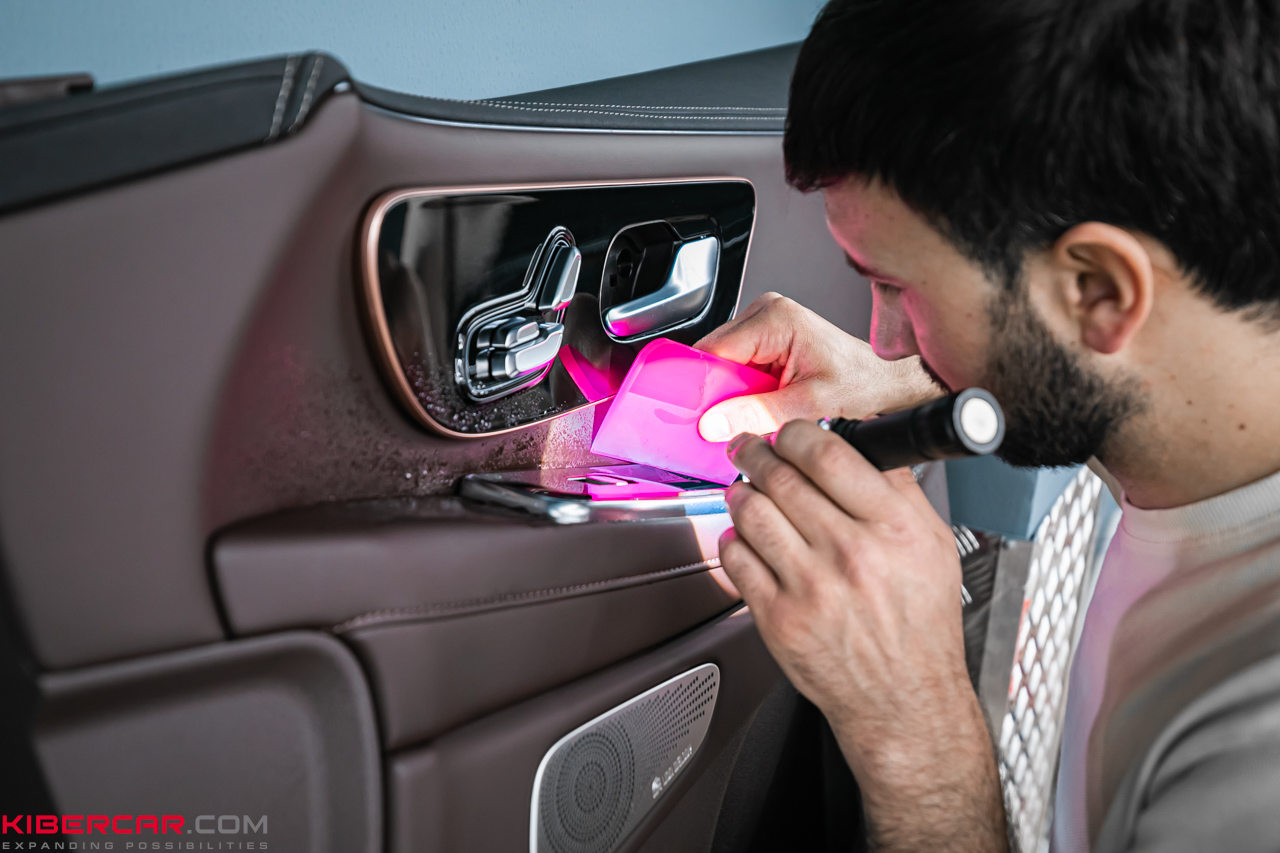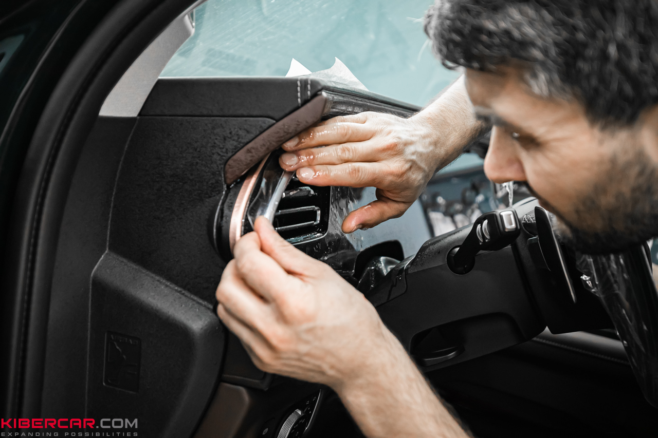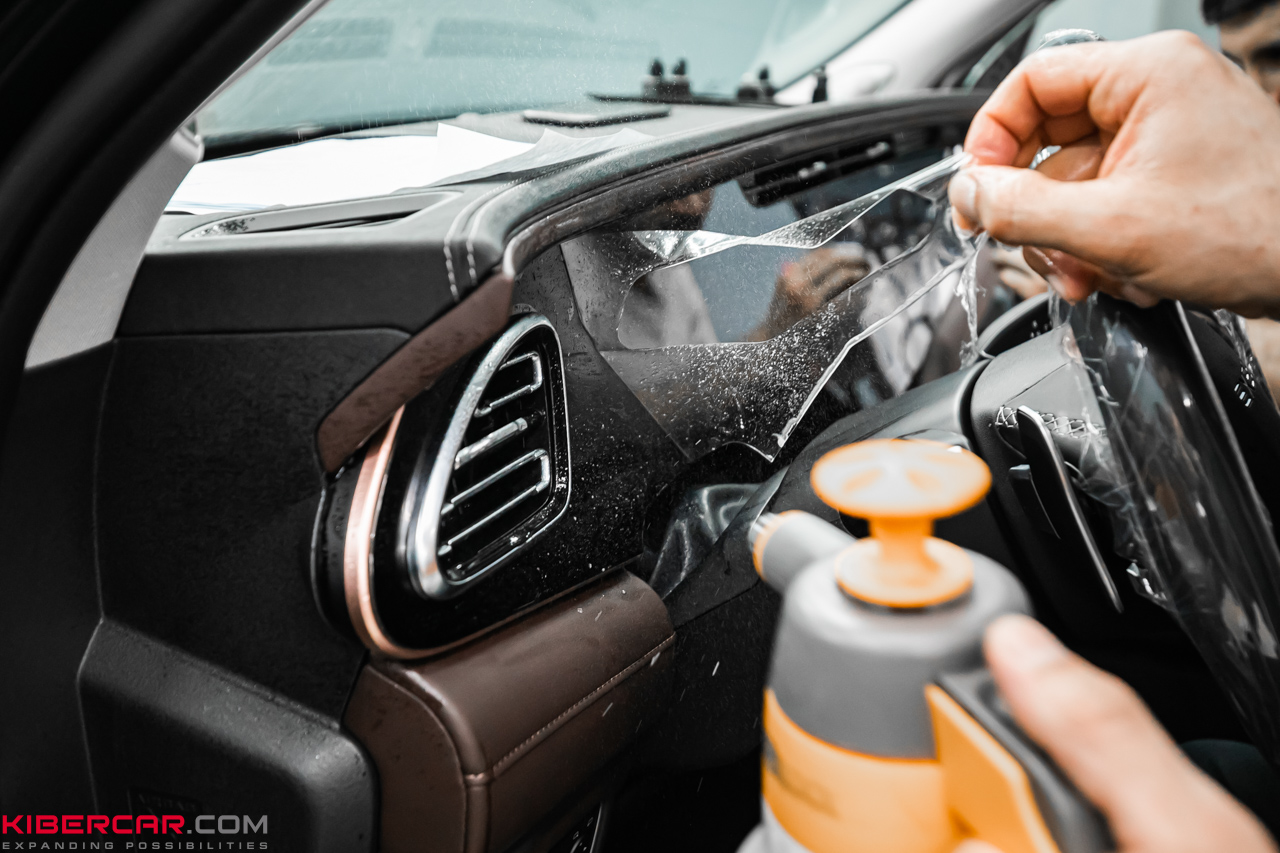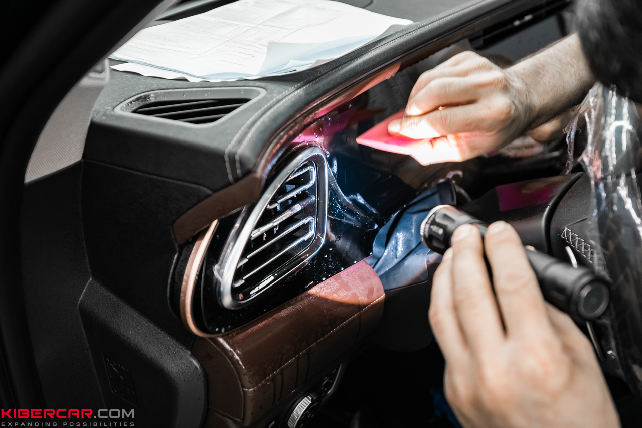 Пленка наклеивается аналогичным образом как на кузове, так и на элементах внутри салона. Владелец EXEED VX 2023 решил выполнить оклейку передней панели, чтобы избежать истирания глянцевой поверхности. Пленка не привлекает внимания, смотрится как часть штатного дизайна.