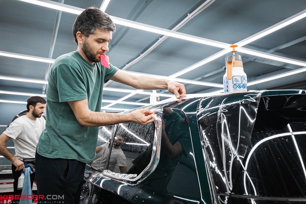 Мы используем «мокрый» способ оклейки. Вначале сбрызгиваем поверхность детали водой, затем наклеиваем материал и прижимаем его к поверхности, выгоняя воздух наружу. Это позволяет избежать образования пузырей и складок. Затем убираем излишки материала, следя за плотным прилеганием покрытия по краям.