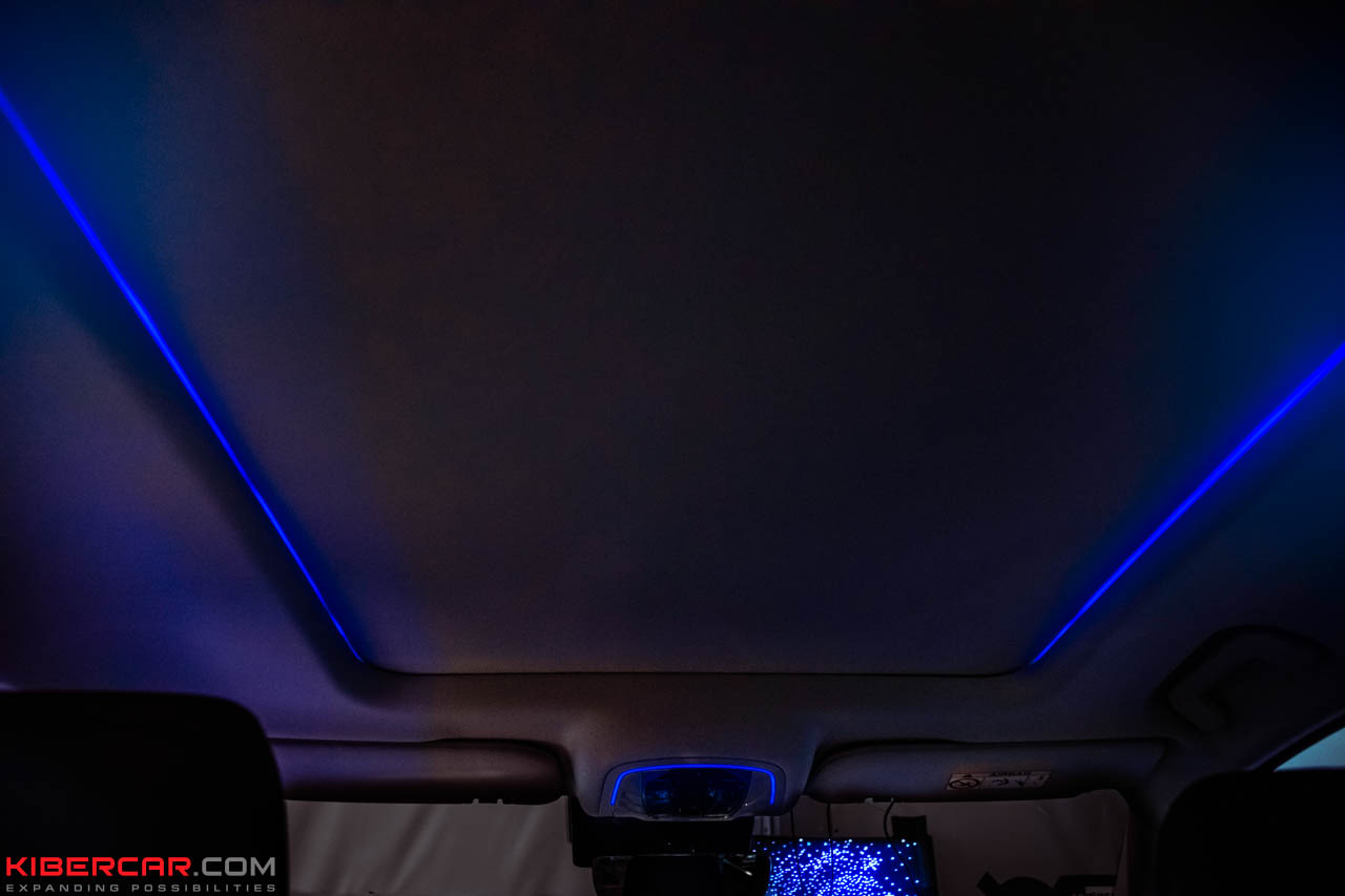 Штатная подсветка авто была недостаточно интенсивной – изначально освещались только дверные карты спереди и передняя консоль. После монтажа новой системы освещения салон полностью преобразился. Мы установили акриловые нити в дверные карманы, в зоне порогов и ног, на потолке. Также мастера подсветили центральный тоннель, верхнюю кромку дверей.