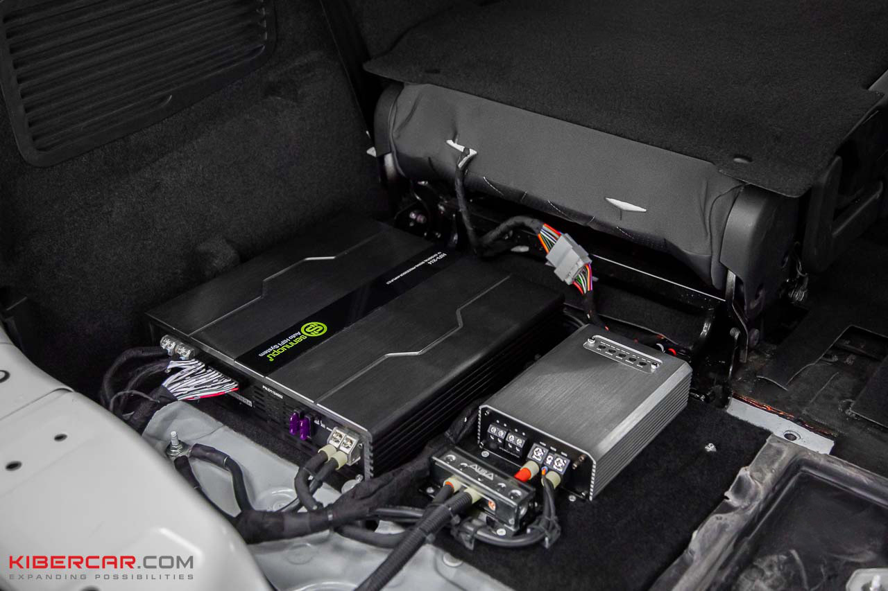 Чтобы подключить все динамики поканально, потребовалось бы слишком много каналов усиления. Мы решили обойтись усилителем Sennuopu X14 – 14 канальным усилителем, с 16-канальным процессором. Он разместился на месте штатного сабвуфера, слева в подполье багажника.