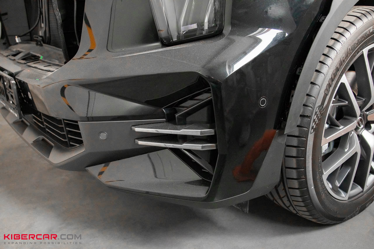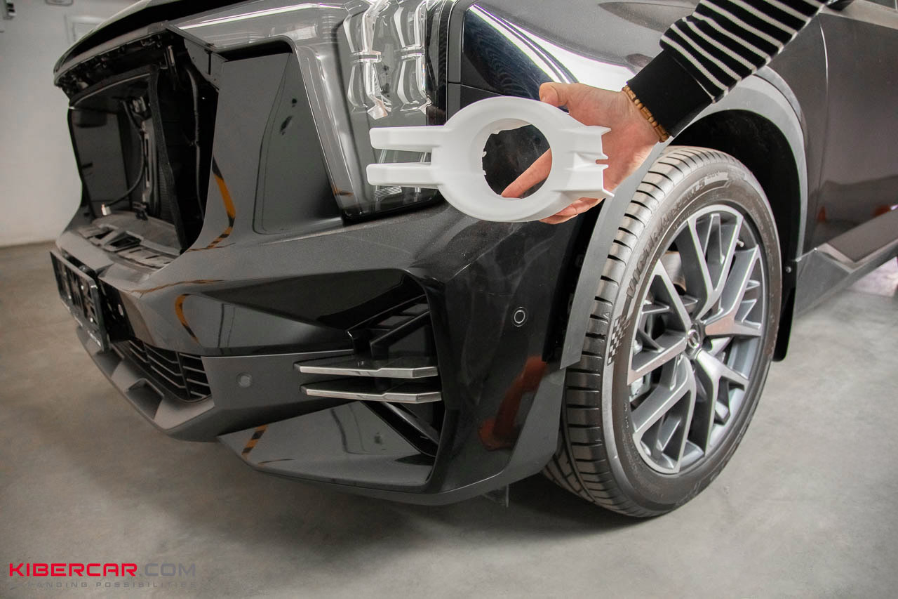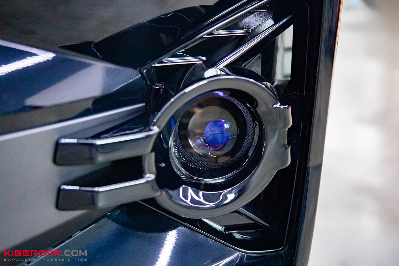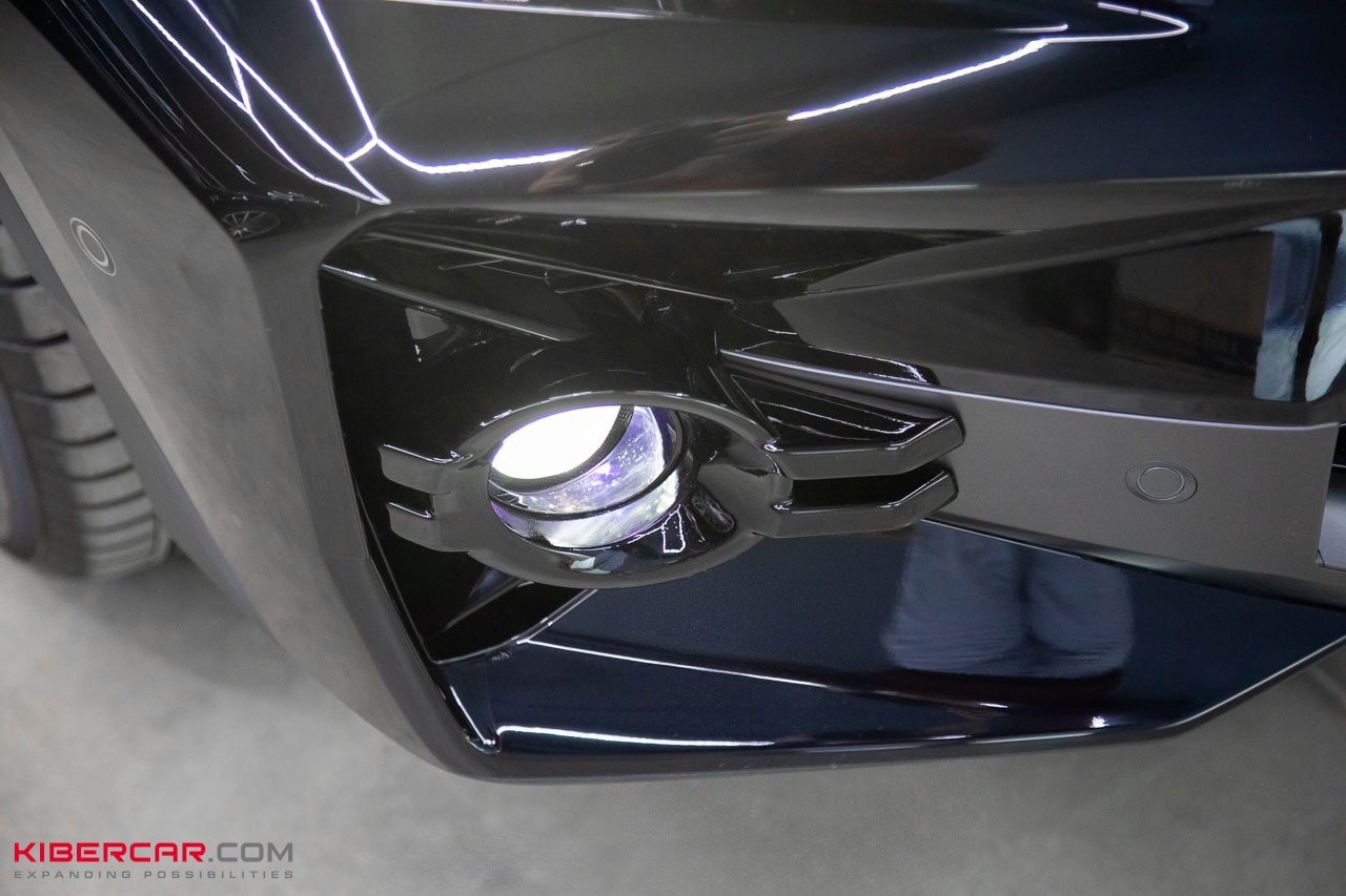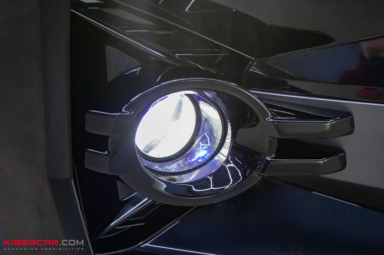 Для достижения нашей задачи мы сделали замеры и изготовили специальные переходные кронштейны под линзы. Затем покрасили их в цвет кузова и установили в бампер. Таким образом, вся конструкция выглядит как часть заводского дизайна, и фары смотрятся как противотуманные, хотя на самом деле это Би-LED линзы.