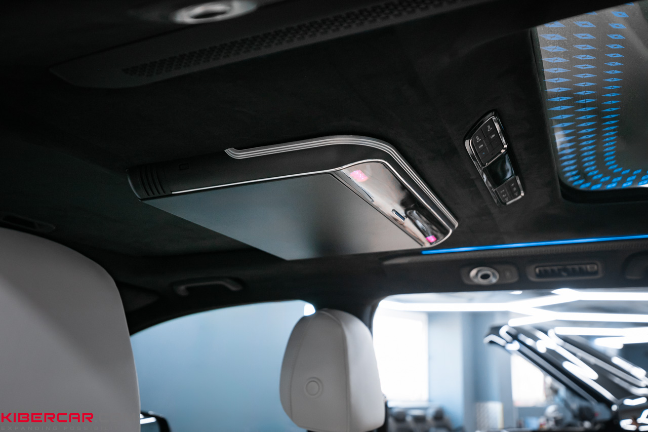 В GAC M8, который приехал в наш салон, был абсолютно ровный потолок. Мы установили крепления для монитора, и, собственно, сам монитор. В сложенном виде он плотно прилегает к поверхности потолка, а в разложенном – располагается как раз на уровне глаз.