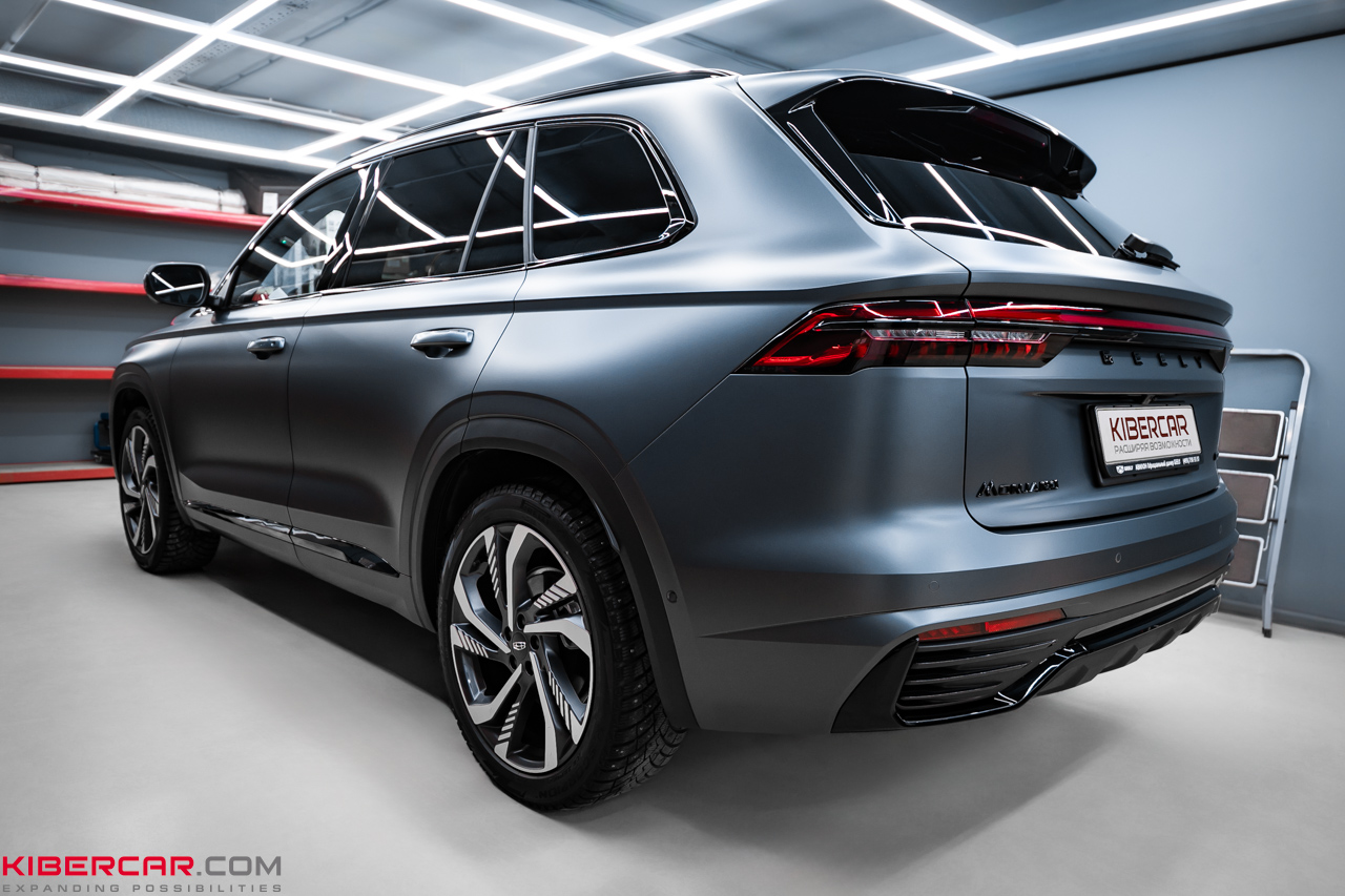 Недавно в наш центр прибыл Geely Monjaro для проведения стайлинга. Владелец автомобиля решил поработать над его внешним видом, заменив штатный дизайн на что-то более современное. Посовещавшись, мы остановились на проекте, включающем оклейку кузова матовой пленкой и антихром отдельных деталей.
