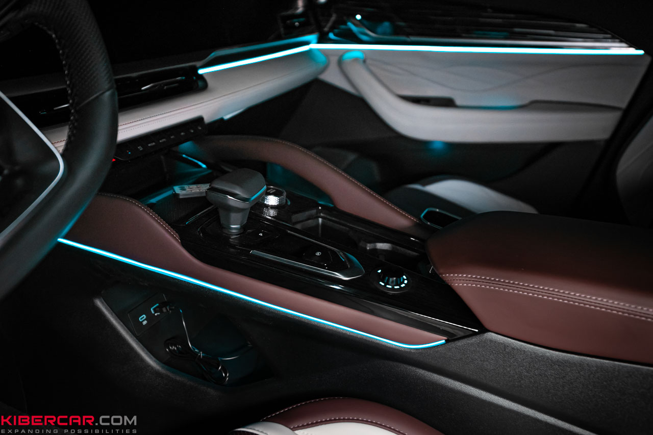 Зачастую штатная подсветка выглядит чересчур банально. К нам часто обращаются клиенты, которые хотят сделать ее частью дизайна салона, добавив ярких цветов и строгих линий. Этот вопрос и привел к нам владельца Geely Monjaro. Мы предложили ему оптимальное решение – установить атмосферную подсветку с гибкими настройками.