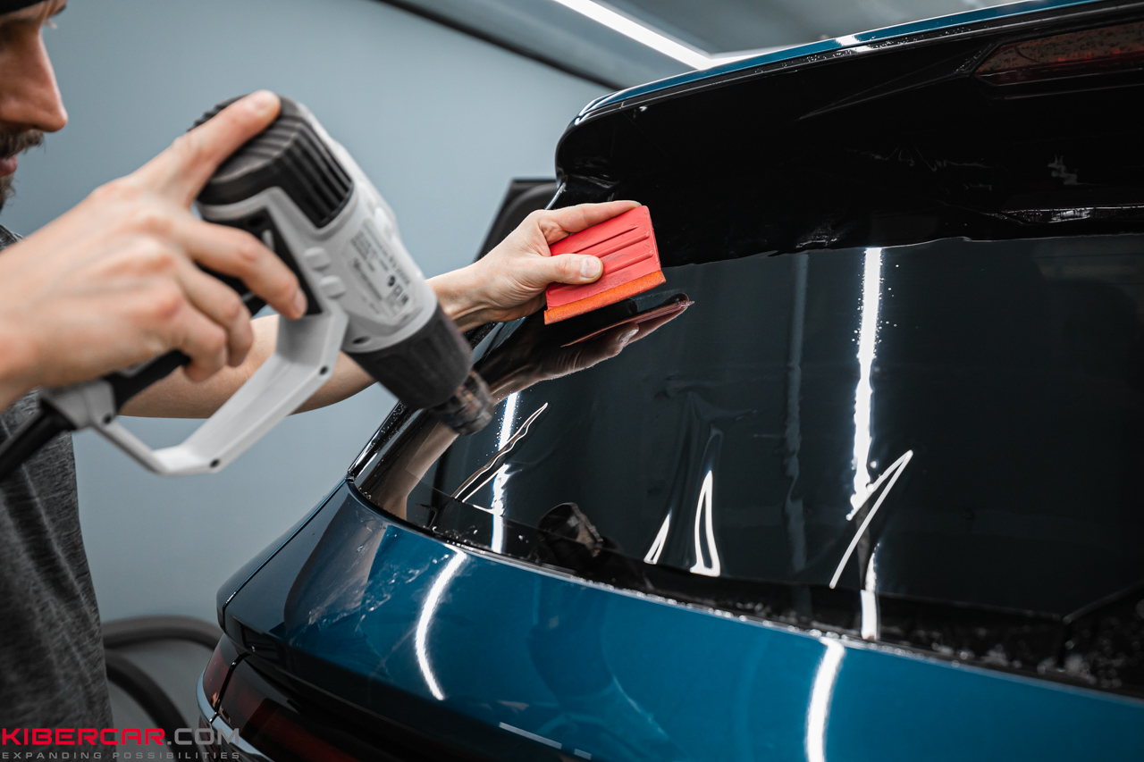 Тонировочную пленку наклеивали после предварительного прогрева. Раскроенный материал приложили к поверхности, а затем разгладили, следя за тем, чтобы не осталось складок. Излишки материала обрезали по периметру при помощи мягких стальных лезвий. Тонировочная пленка имеет хорошую степень адгезии по всей поверхности, поэтому не должна отслаиваться у краев.