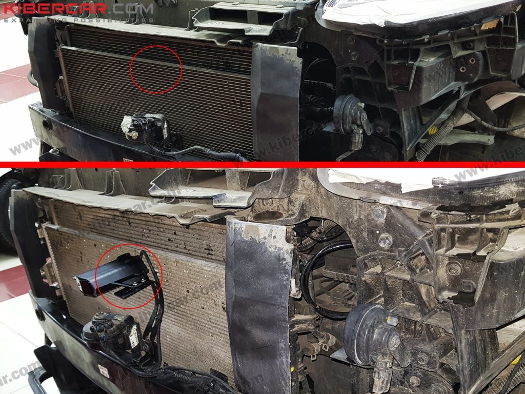 Сначала устанавливаем радарный блок за передний бампер автомобиля. Для этого снимаем бампер и производим установку.