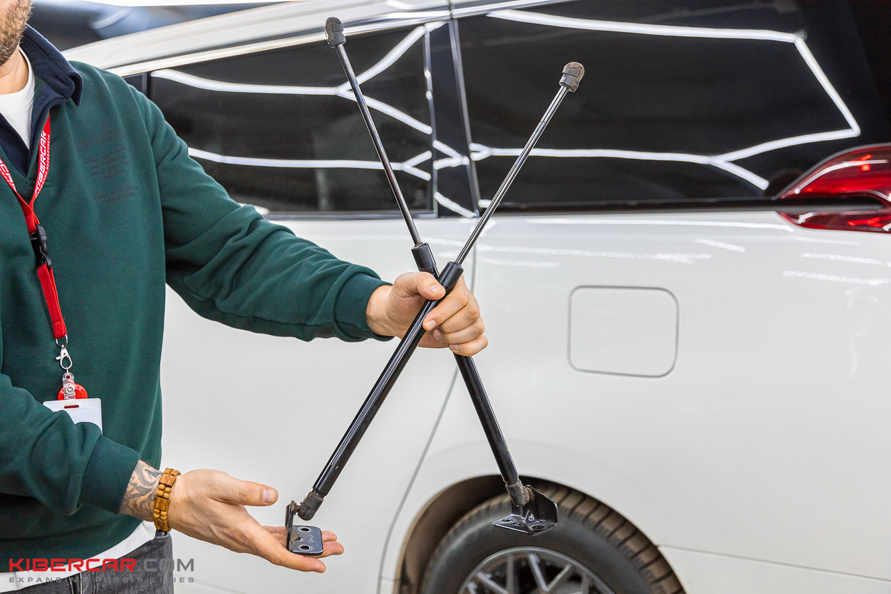 Электропривод багажника мы установили вместо штатных газовых стоек. Также заменили ручку крышки багажника на кнопку: нужно нажать на нее, чтобы крышка начала подниматься вверх.