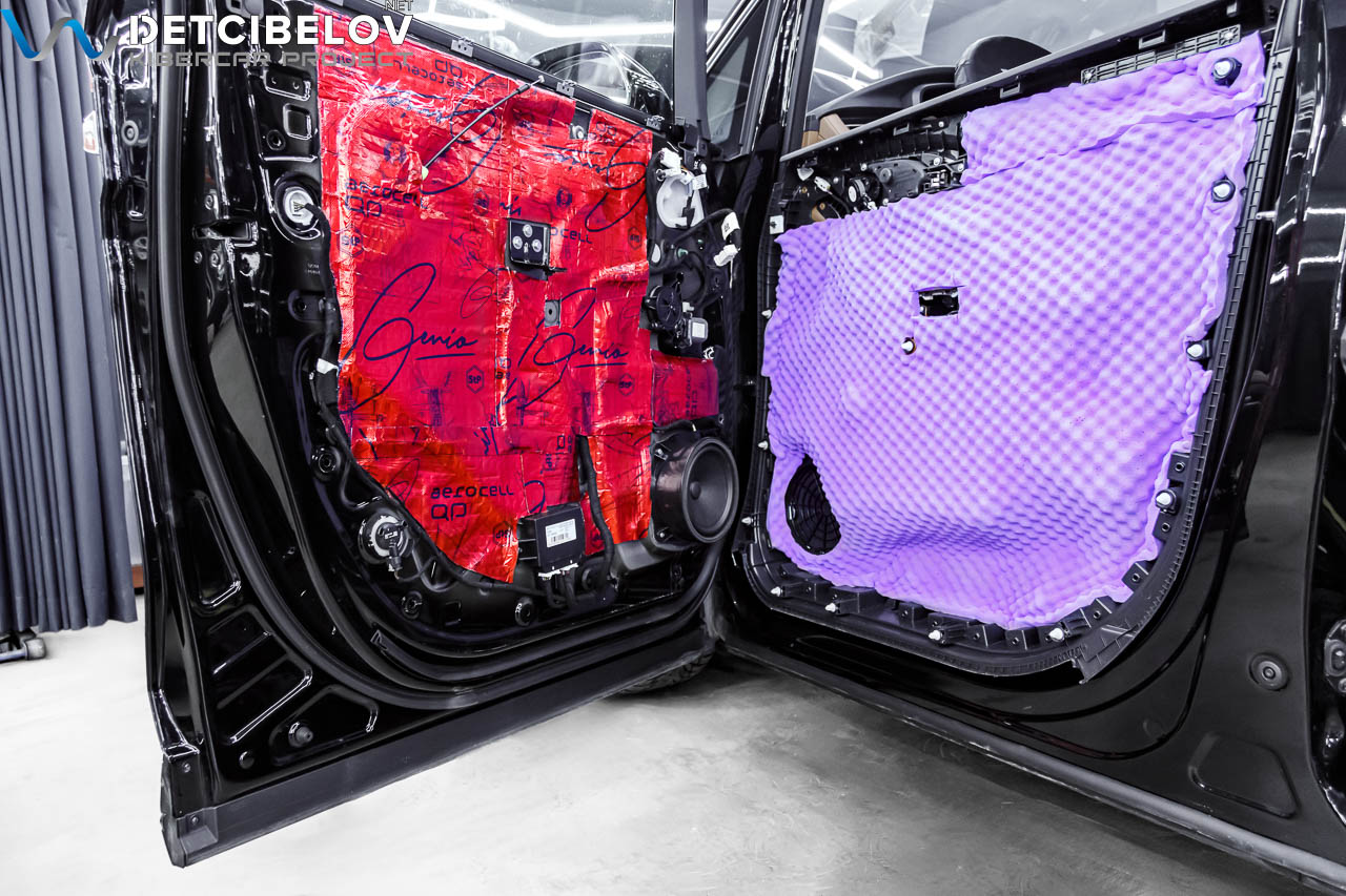 Чтобы снизить уровень шума и вибраций в салоне, обработали несколько основных зон: двери, пол, багажник, внутренние арки, капот и крышку багажника. На дверях использовали комбинацию из Aerocell QP Intrigo (6 мм), Aerocell QP Genio (4 мм) и Biplast Premium (15 мм). Такое сочетание нейтрализует вибрации и шумы, но получается не слишком объемным, поэтому двери будут свободно открываться и закрываться.