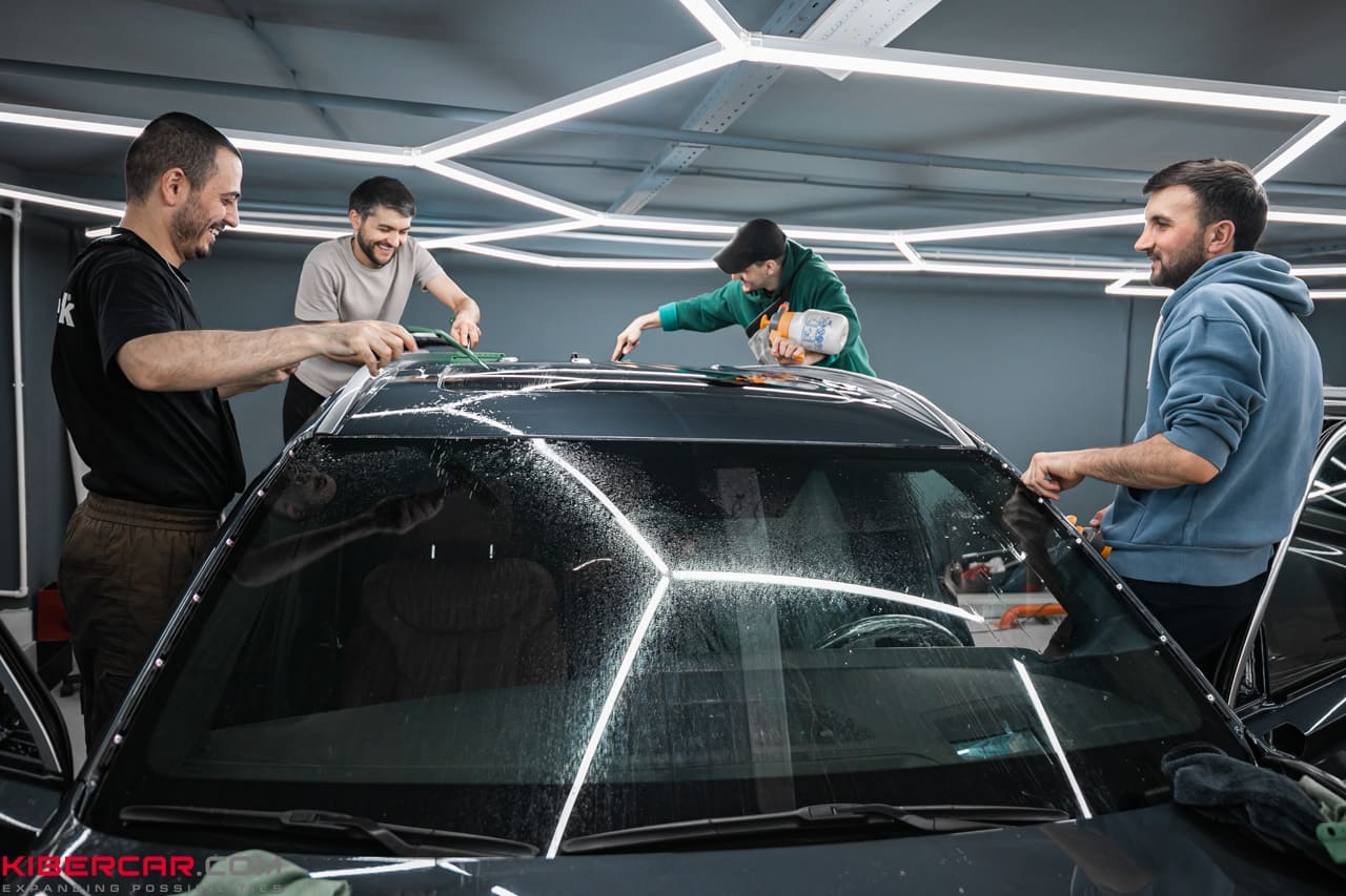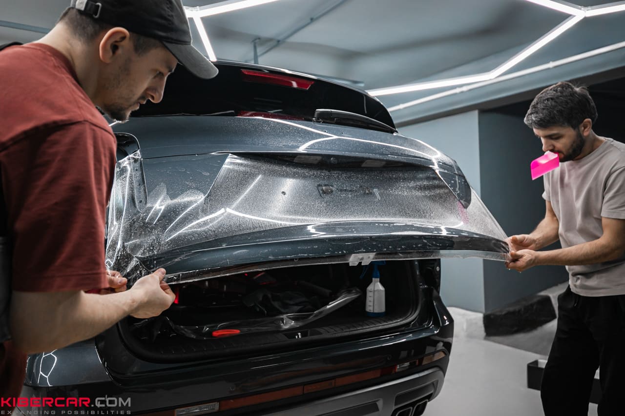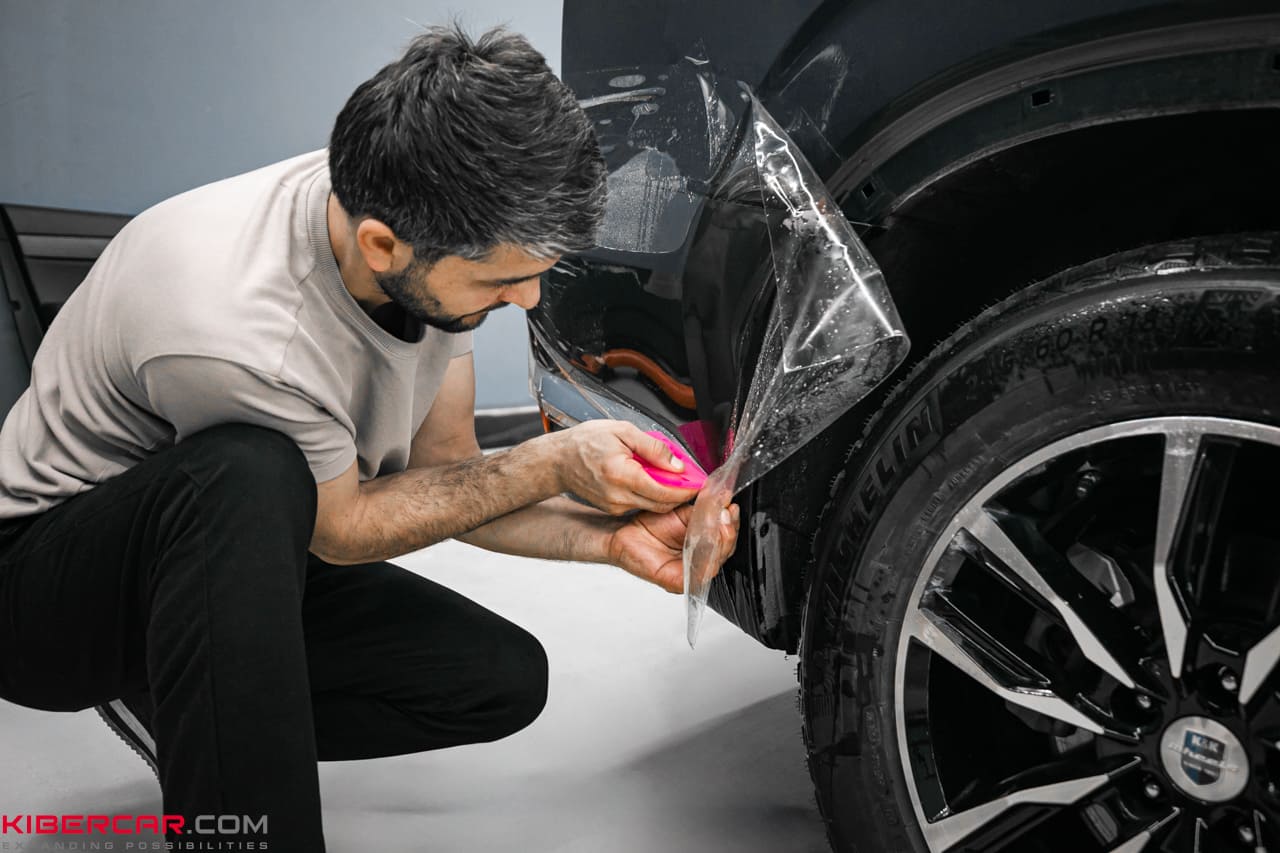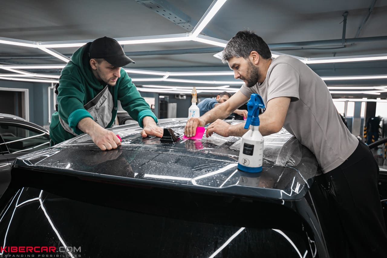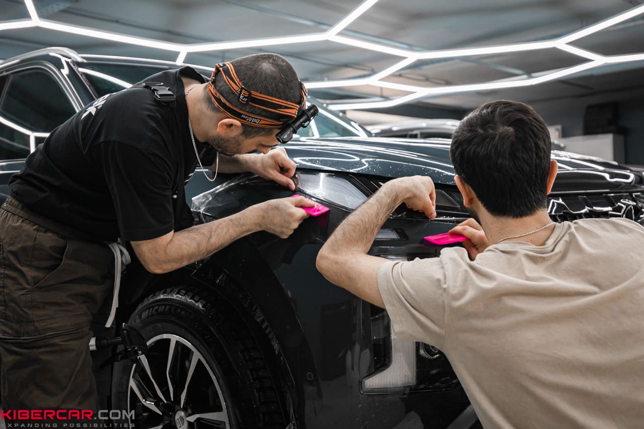 Процесс оклейки защитной пленкой начинается с тщательной мойки автомобиля. Если автомобиль новый, он проходит двухфазную мойку, при которой особое внимание уделяется труднодоступным местам, чтобы удалить песок из всех щелей. Перед нанесением пленки проводится подготовительная полировка. Для новых автомобилей это мягкая полировка, предназначенная для удаления налета, который может появиться после транспортировки. Для автомобилей с пробегом, возможно, потребуется абразивная полировка в два или три этапа, которая удалит все мелкие царапины и «паутинки». После полировки производится разбор автомобиля. В зависимости от модели автомобиля разбираются зеркала, ручки, рейлинги, молдинги, бамперы, задние фонари и другие элементы. Также удаляются шильдики, накладки и прочие детали, которые могут помешать процессу оклейки.