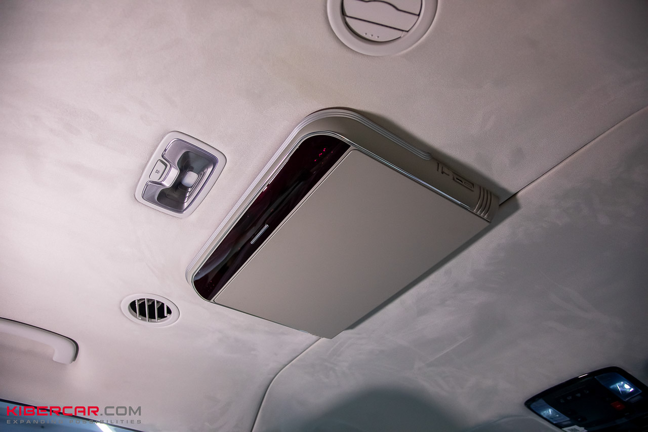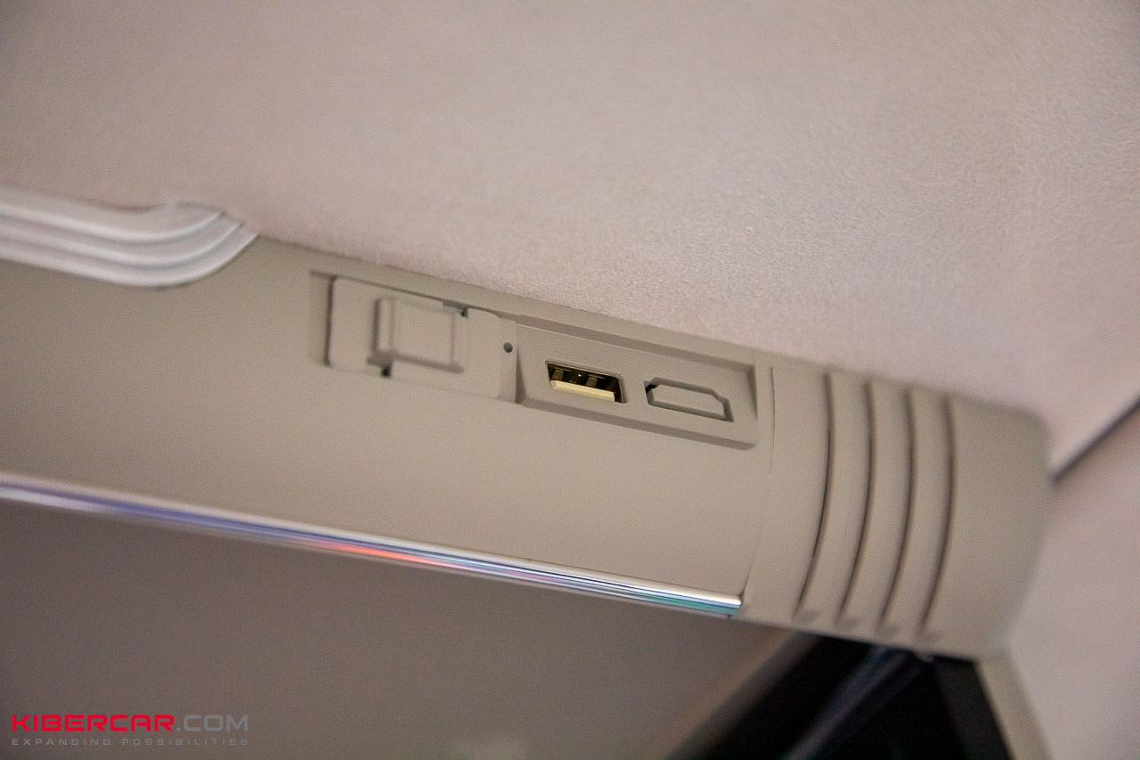 Для установки потолочного монитора используется прочная и надежная система креплений. Сам монитор в сложенном виде образует почти ровную плоскость с поверхностью потолка. Он никак не мешает ни водителю, ни пассажирам.