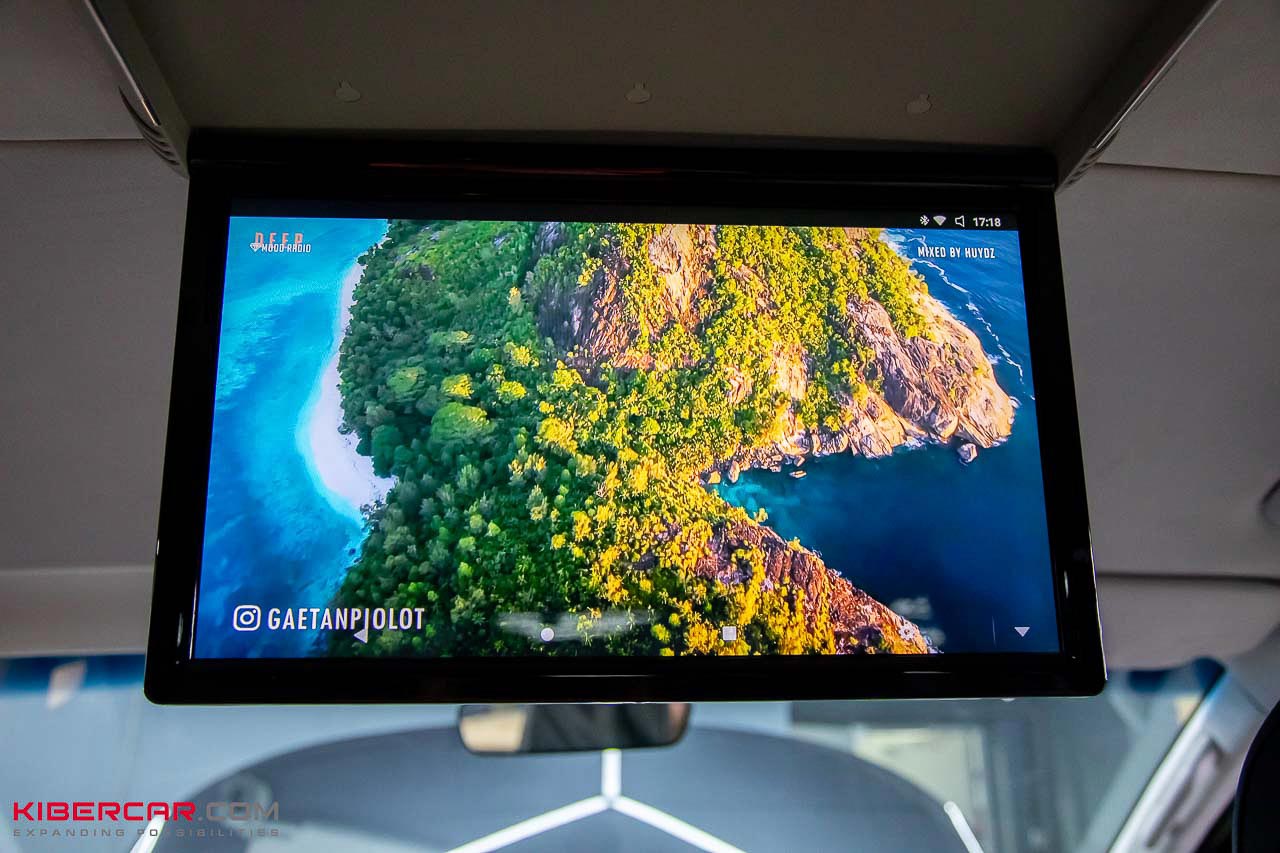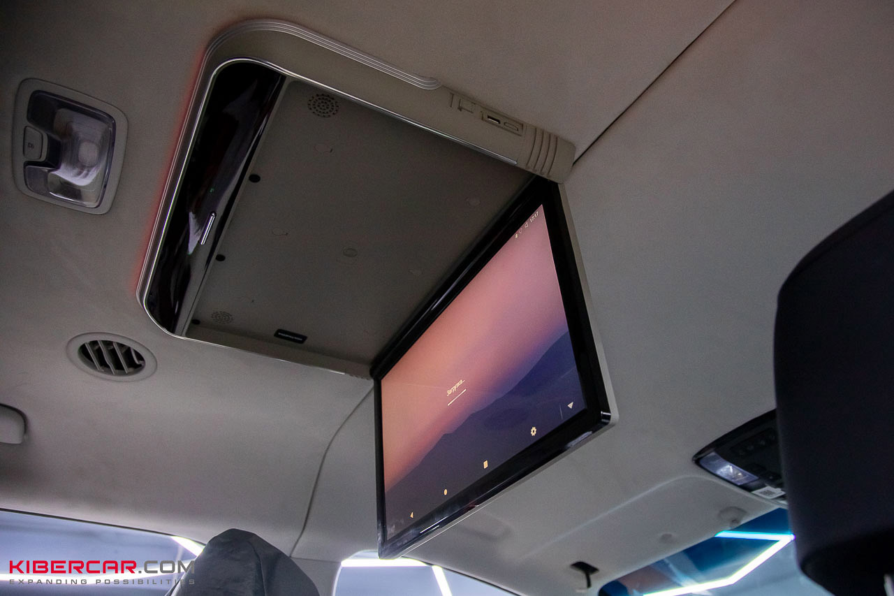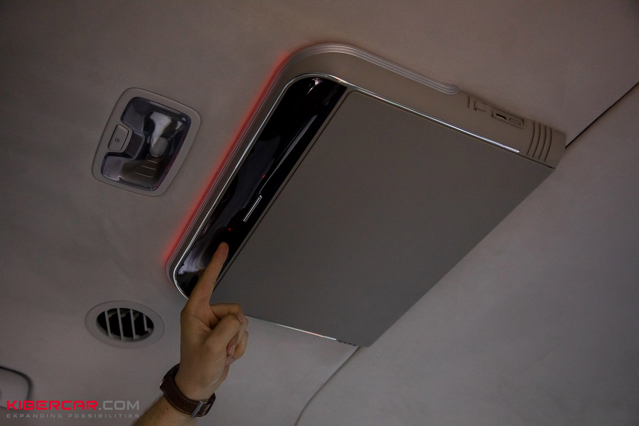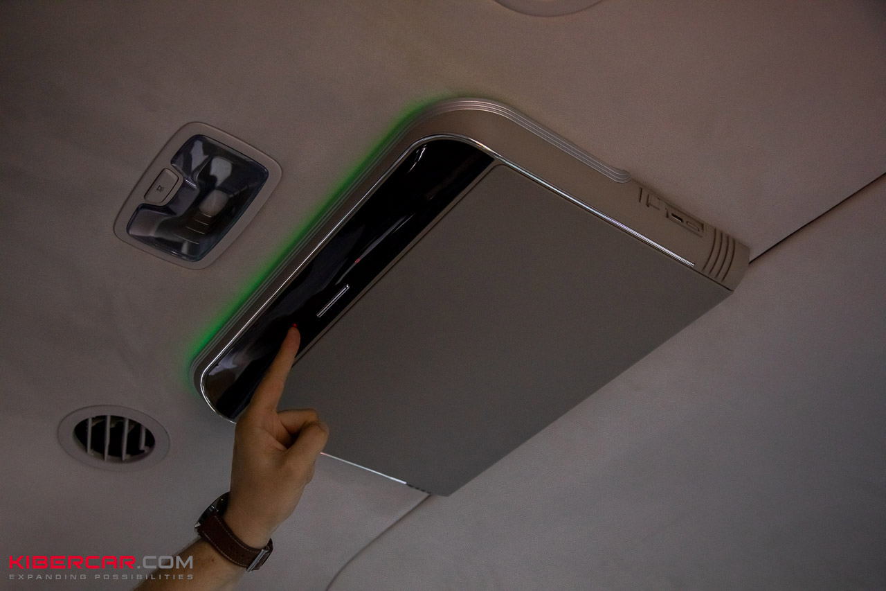 Потолочный монитор оснащён разноцветной подсветкой, которая оригинально дополняет интерьер салона в темное время суток. Для смены положения достаточно нажать на кнопку. Монитор работает на ОС Андроид, поэтому интерфейс прост и понятен.