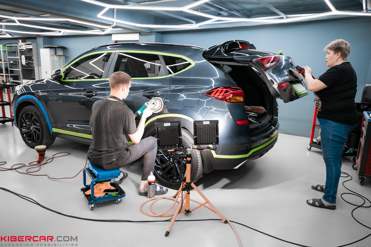 Мы предложили владельцу Hyundai Tucson провести полировку. Это стандартная процедура, которая заключается в удалении тончайшего слоя лакокрасочного покрытия для устранения поверхностных дефектов. Главная сложность в том, чтобы удалить только поврежденную часть покрытия.