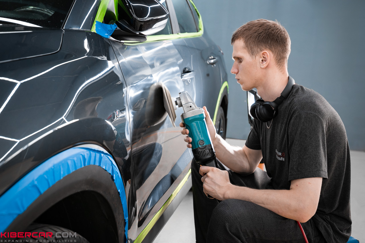 Для начала автомобиль был тщательно вымыт. Это необходимо, чтобы можно было оценить текущее состояние лакокрасочного покрытия – детально рассмотреть все микроцарапины и трещины. После этого удалось подобрать полировочные пасты с разной степенью абразивности и соответствующие инструменты. Затем команда приступила к работе. Мы оклеили колесные арки, пороги, стекла, чтобы не повредить абразивными составами. Полировку выполнили в несколько этапов: удалили сначала грубые дефекты, потом мелкие. В конце можно выполнить восстановительную полировку неабразивной пастой, обработать лакокрасочное покрытие воском или полимерными составами.