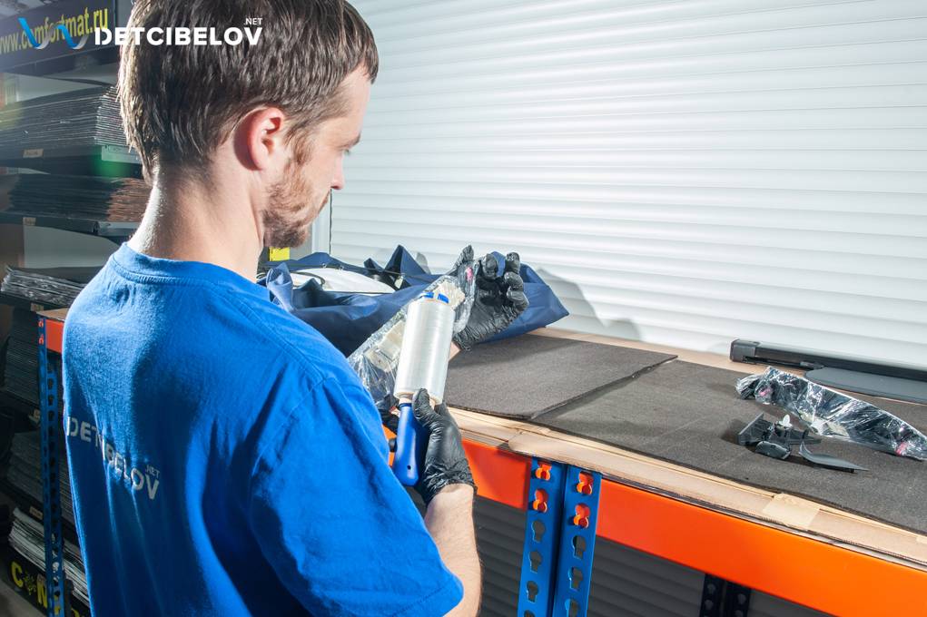 Для виброизоляция пола мы используем вибродемпфер Comfort mat Extreme 3.5 — это мастично-битумный сэндвич с рекордной толщиной 3,5 мм и двумя слоями фольги, который убирает низкочастотные структурные шумы металла. Это «Царь» среди виброизоляционных материалов, с уникальной структурой мастики и лучшими показателями снижения вибрации. Нагреваем его при температуре 60-80 градусов в специальной печи, это обязательное условие, иначе качественно нанести этот материал не удастся. Его мы используем на полу и на задних колесных арках. В багажном пространстве пол и крылья покрываем материалом Comfort mat Dark D3.