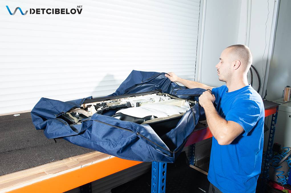 Приступаем к работе. Первым делом максимально защищаем автомобиль: оклеиваем пленкой все внешние элементы автомобиля, затем наносим скот на пороги и арки дверей, упаковываем все мелкие пластиковые элементы в стретч-пленку. Сиденья и карты дверей помещаем в специальные чехлы.