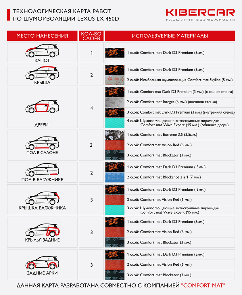 • Только один вариант шумоизоляции – МАКСИМАЛЬНЫЙ. Делаем исключительно возможный для выбранной марки вариант шумоизоляции, который позволит добиться наилучшего акустического комфорта и избежать следов разбора после проведения работ – как визуальных, так и акустических, например, сверчков и скрипов. Совместно с лаборантами-акустиками завода ComfortMat разрабатывается технологическая карта работ и используемых материалов.