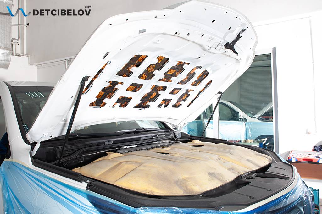 Внутренняя поверхность капота была обработана материалом Comfort mat Dark D3 , и возвращенной штатной шумо-пыле-изоляции , а на крышку багажника мы нанесли Comfort mat Dark D3 и на пластиковую панель наклеили Comfort mat Wave Expert 15мм с увеличенным коэффициентом шумопоглощения.