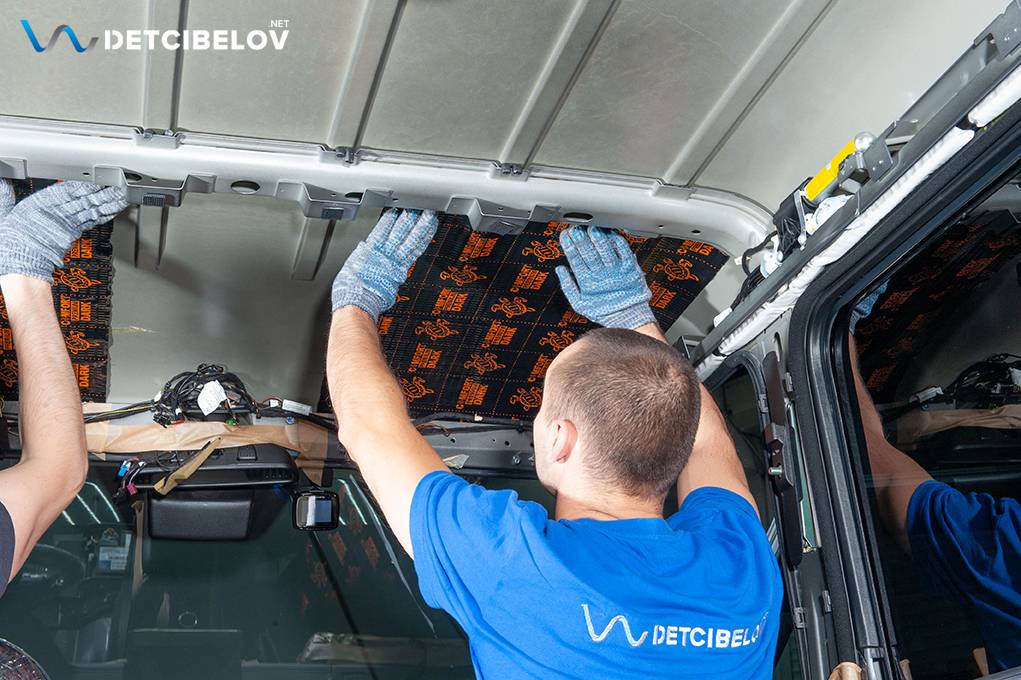 Затем приступаем к шумоизоляции потолка. Максимально аккуратно, чистыми одноразовыми перчатками демонтируем потолочную обшивку. После обезжиривания поверхности потолка начинаем монтаж виброизолятора Comfort mat Dark D3 Premium, а затем шумопоглотитель Comfortmat SkyLine — это легкая мембранная звукоизоляция, рабочая часть этого шумоизоляционного материала состоит из шумоизоляционной прослойки, накрытой плотной тонкой звукоизоляционной мембраной.